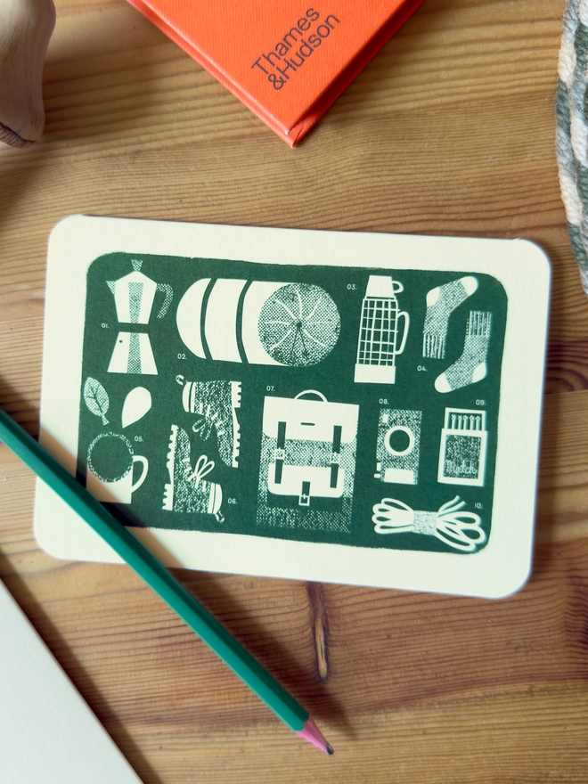 Illustrated greeting card of hiking essentials in the style of a monochromatic blueprint.