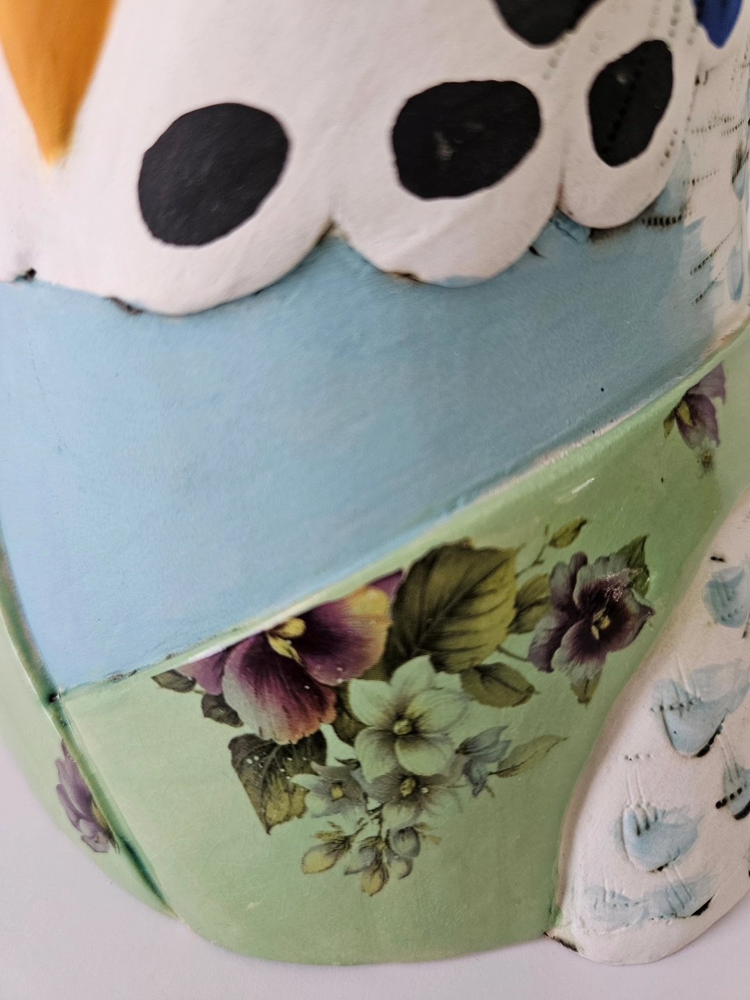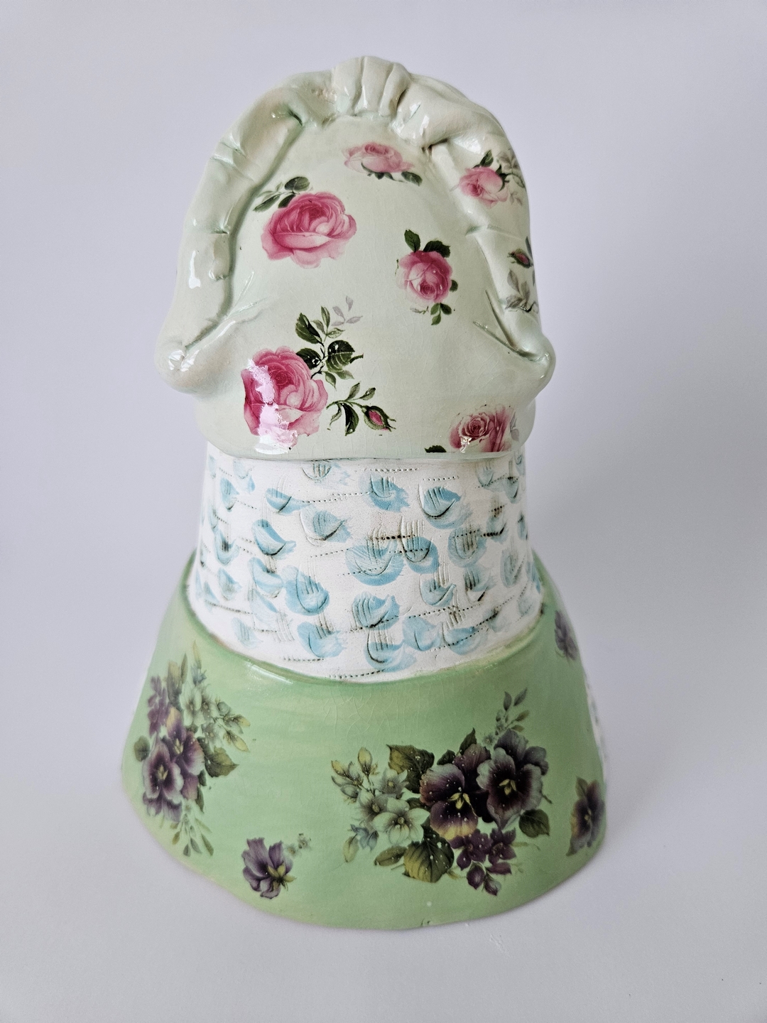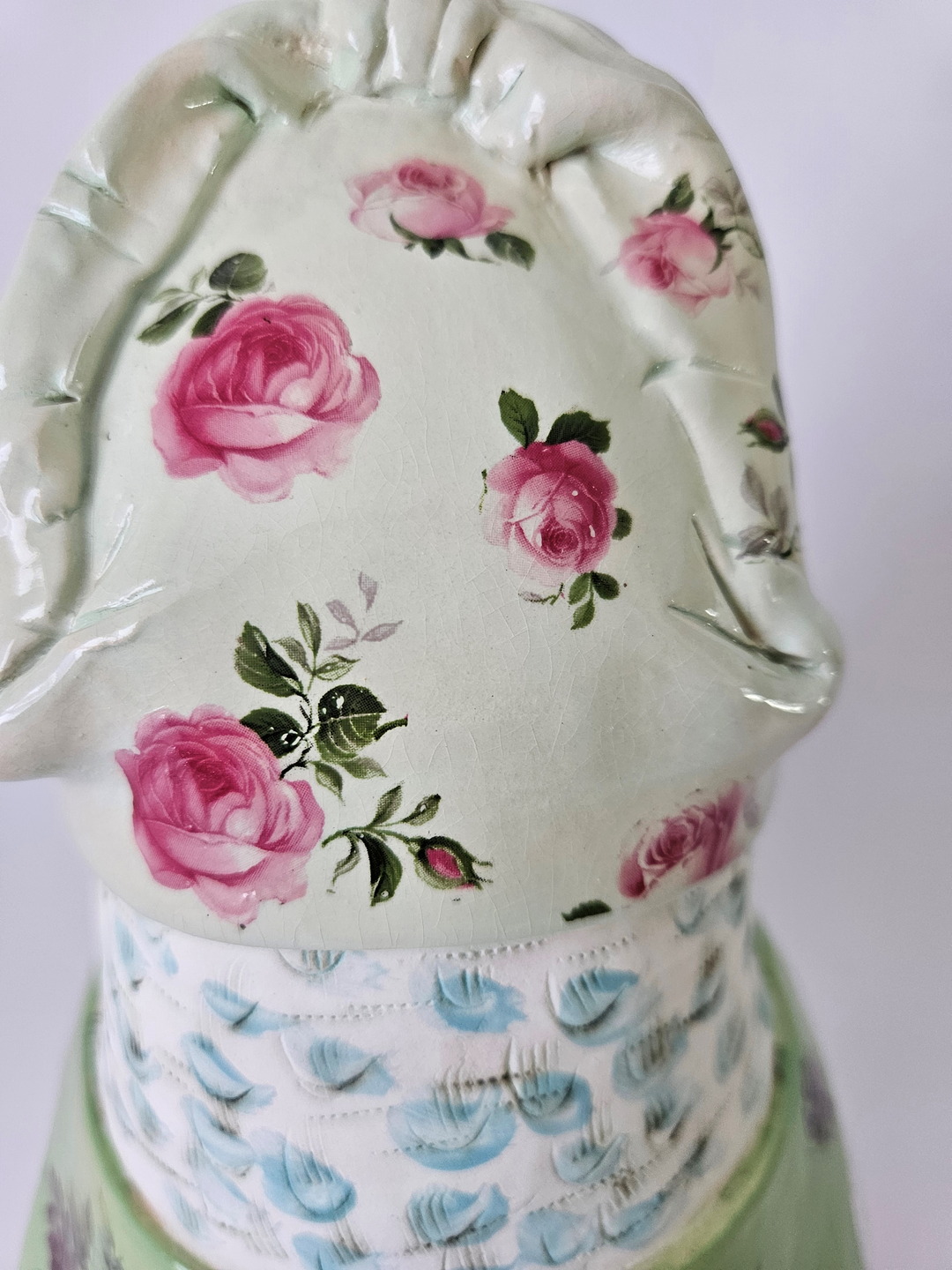 Hilda is handmade from stoneware clay with hand painted under glaze decoration. She has a matt finish with gloss eyes and head scarf and with decal transfer flowers.