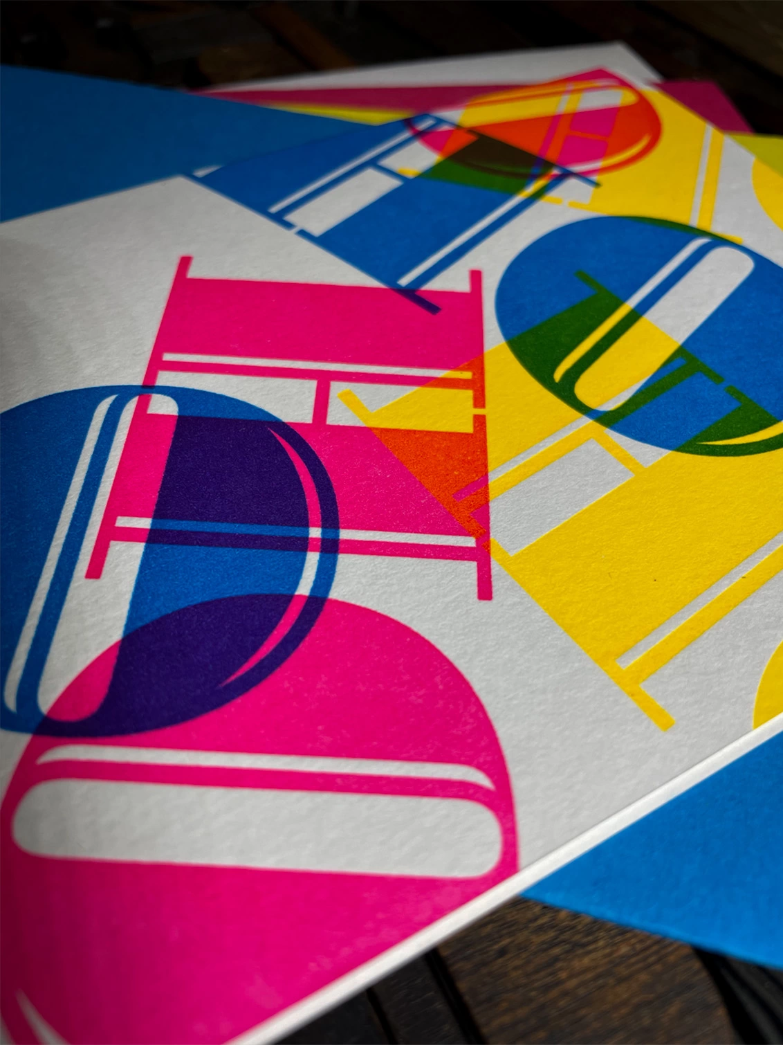 These cards are printed with my own fair hands on my 1915 Arab Crown Folio Press. The card is hand-fed into the press for each of the three colour passes. Printed using vibrant translucent cyan, magenta and yellow inks creates a striking overlay of colour...
