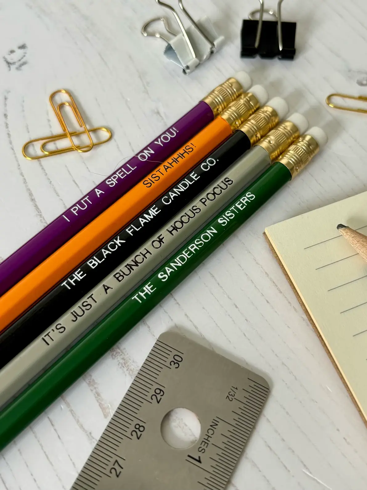 Calling all Hocus Pocus fans! Bring a touch of the Sanderson Sisters' enchantment to your everyday writing with this Hocus Pocus inspired HB pencil set. Each pencil is thoughtfully designed with a Hocus Pocus theme that pays homage to the beloved movie. Embrace the magic of the Sanderson Sisters, these pencils are a must-have addition to your stationery collection.