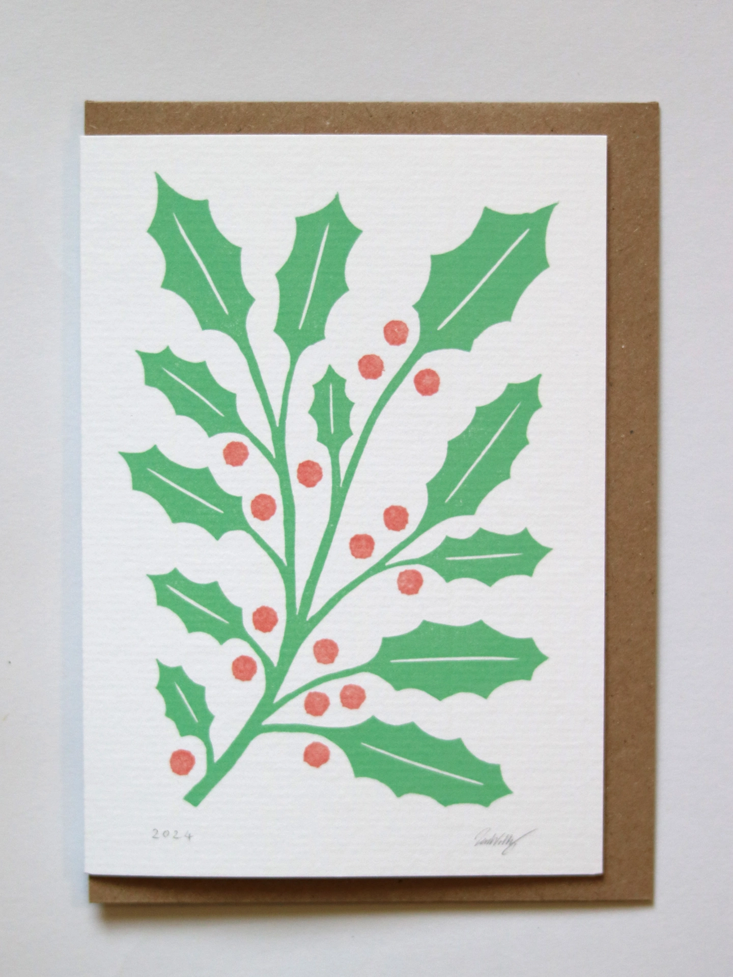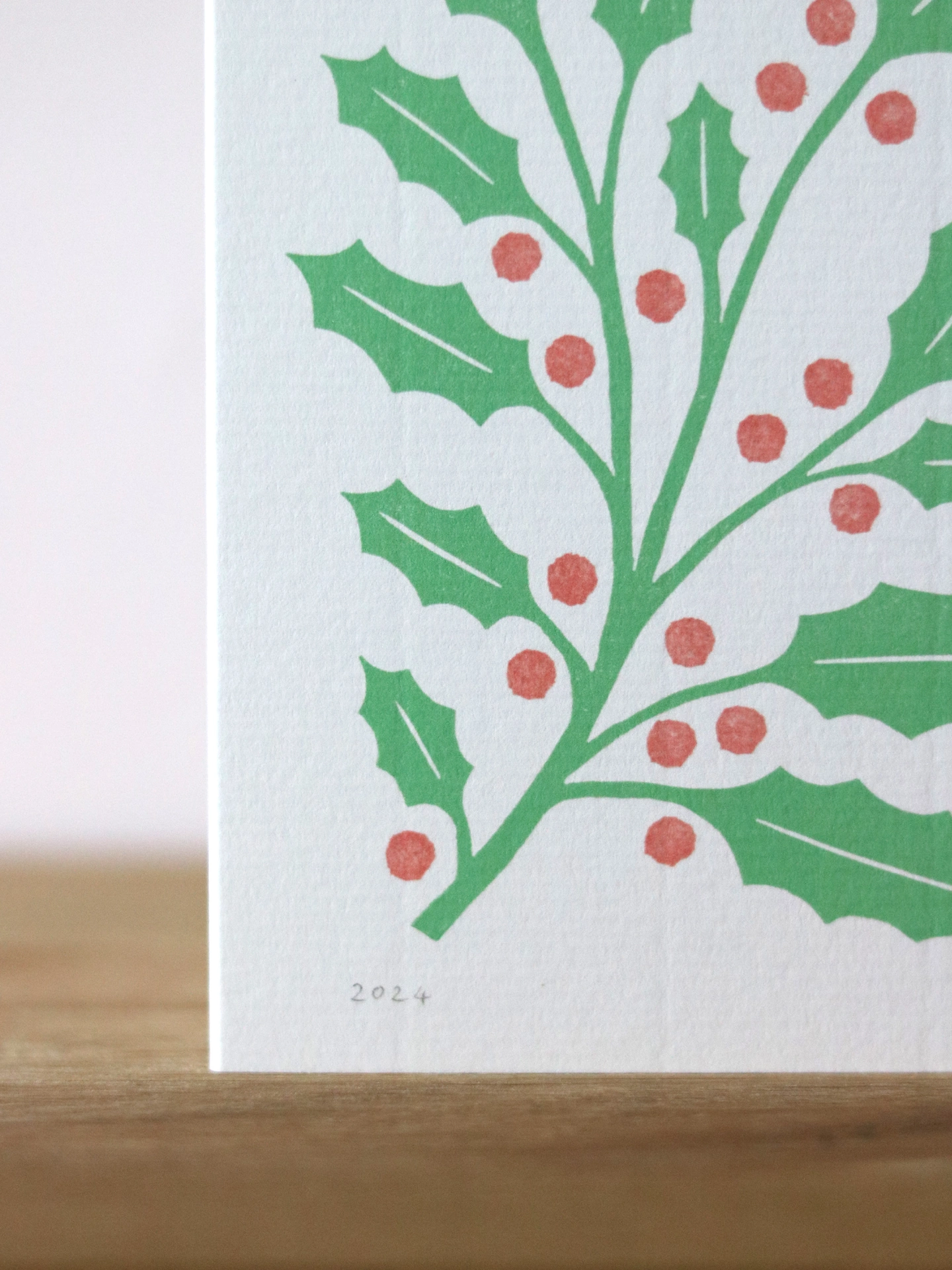 A premium A6 Christmas card, featuring a digital reproduction of an original linocut print of Holly leaves and berries.