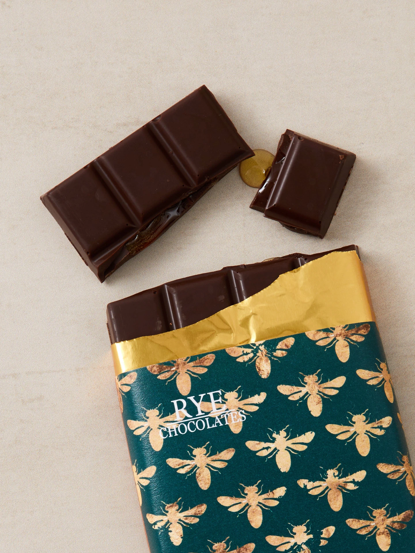 Honey brought to you by local hard-working bees, chocolate made by us, we make a great team. The proof is in the pudding, a layer of honey runs throughout the bar.