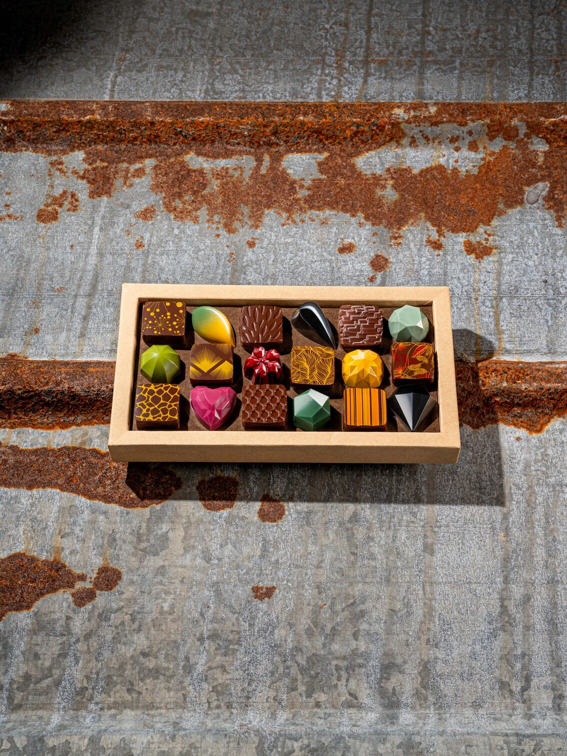 This generous box of 18 handmade bonbons is where craftsmanship meets romance. Featuring a spectrum of bold and delicate flavours—from tart fruits to spiced and herbal notes—each piece is unique and made to be savoured.
