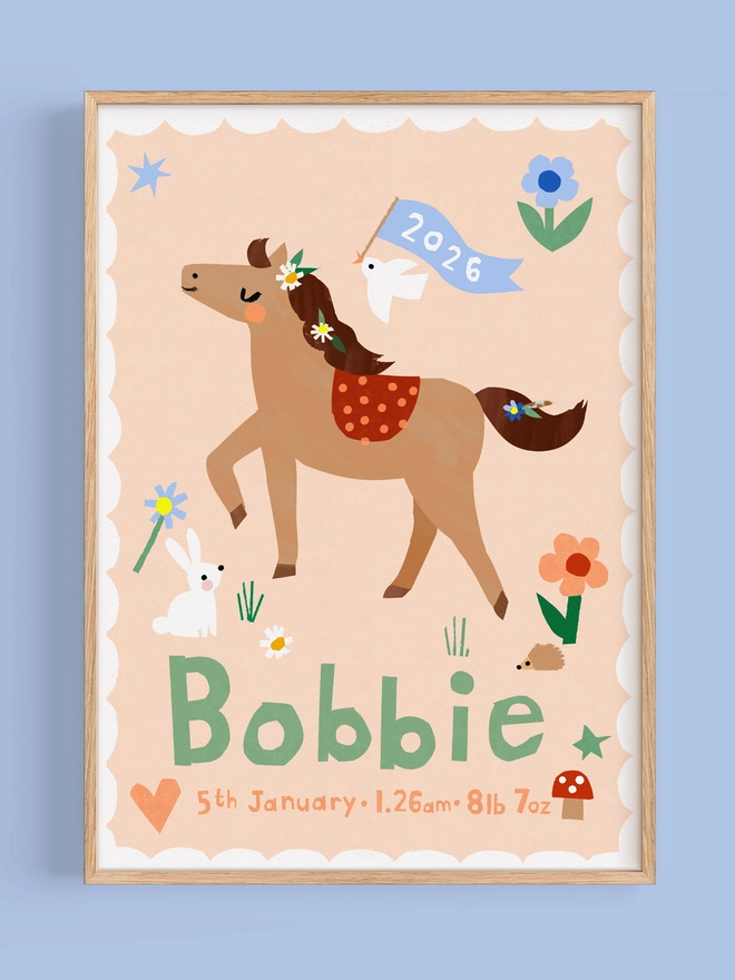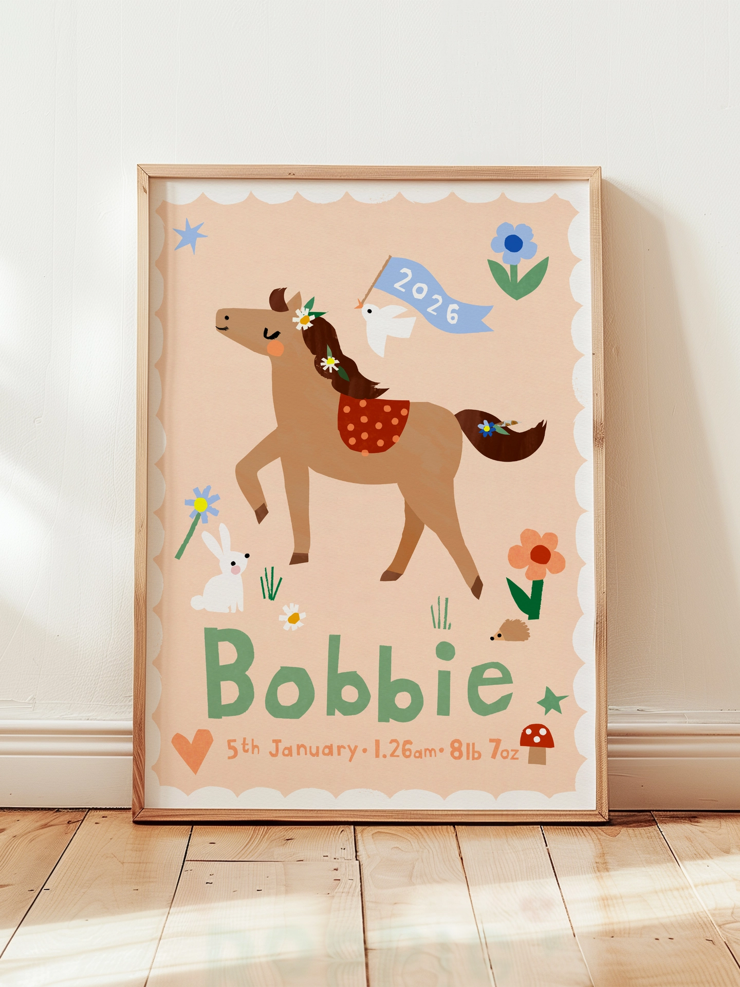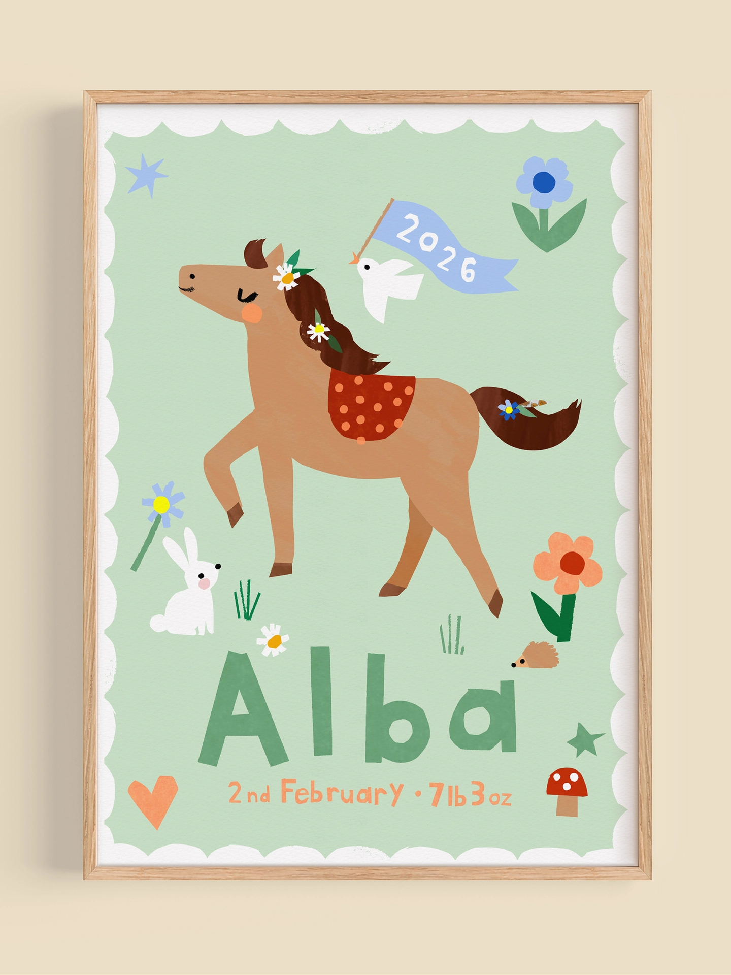 Add the child's name & birth details. Select from 3 colour options - Peach, Mint or Butter.