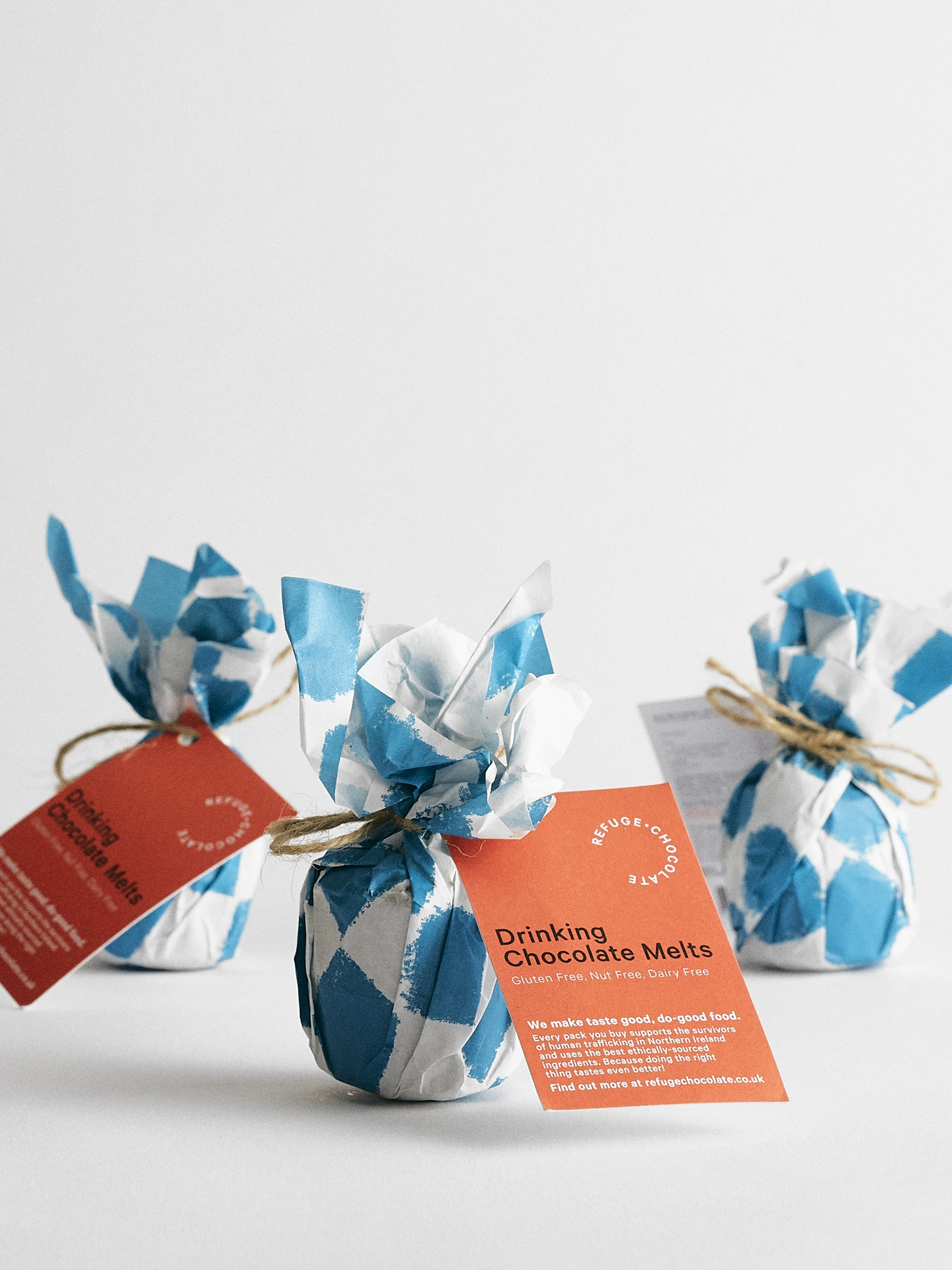 2 x solid chocolate and sugar half round shapes. Add liquid, heat and enjoy. 2 servings per pack. Give a hug in a mug to your favourite human or yourself. Luxurious drinking chocolate; the perfect chocolate gift. Think of our ethical Drinking Chocolate Me...