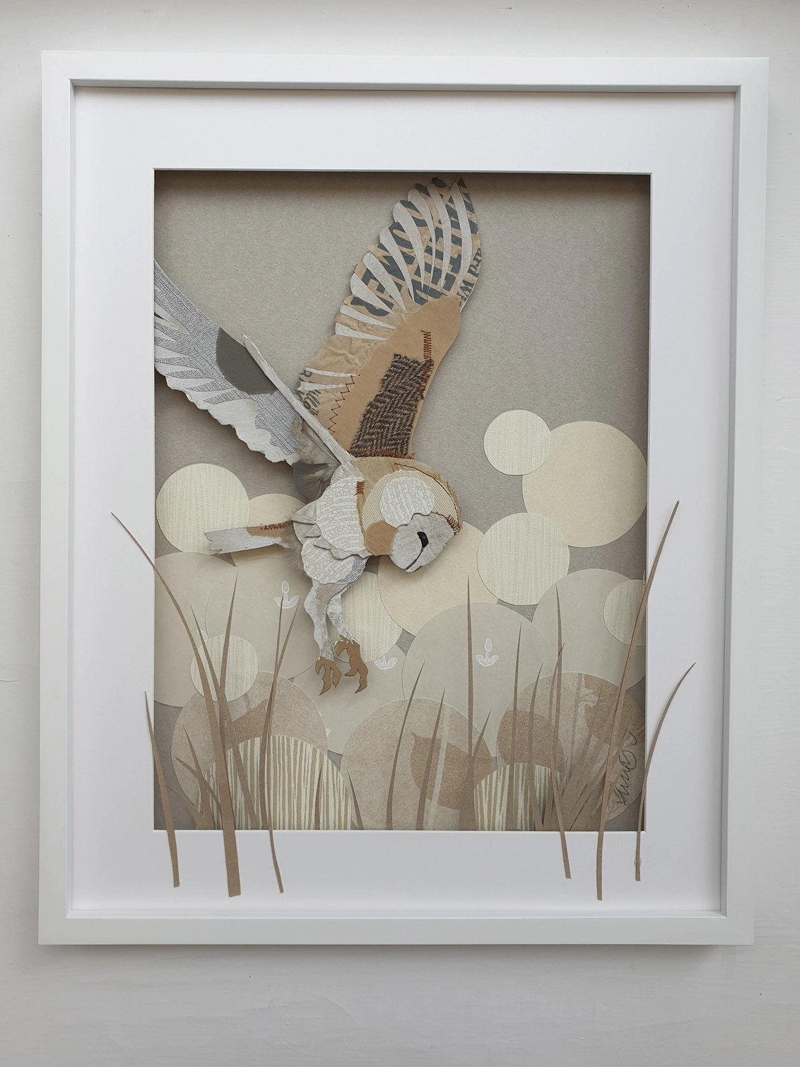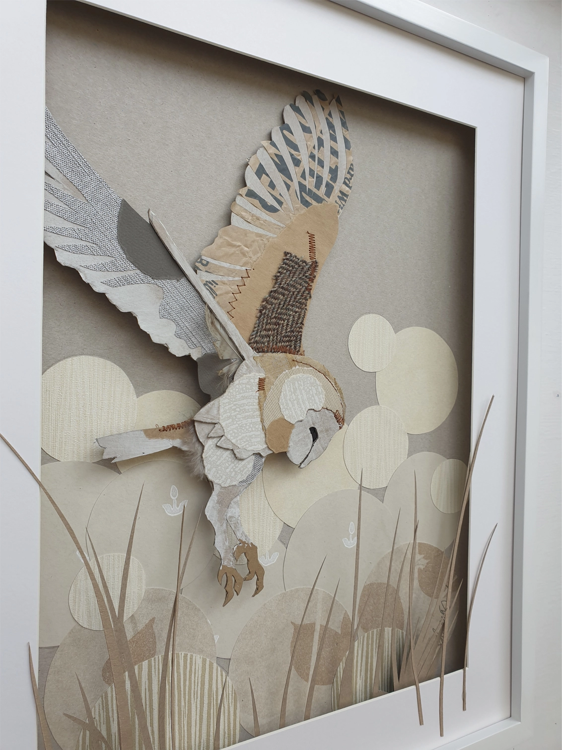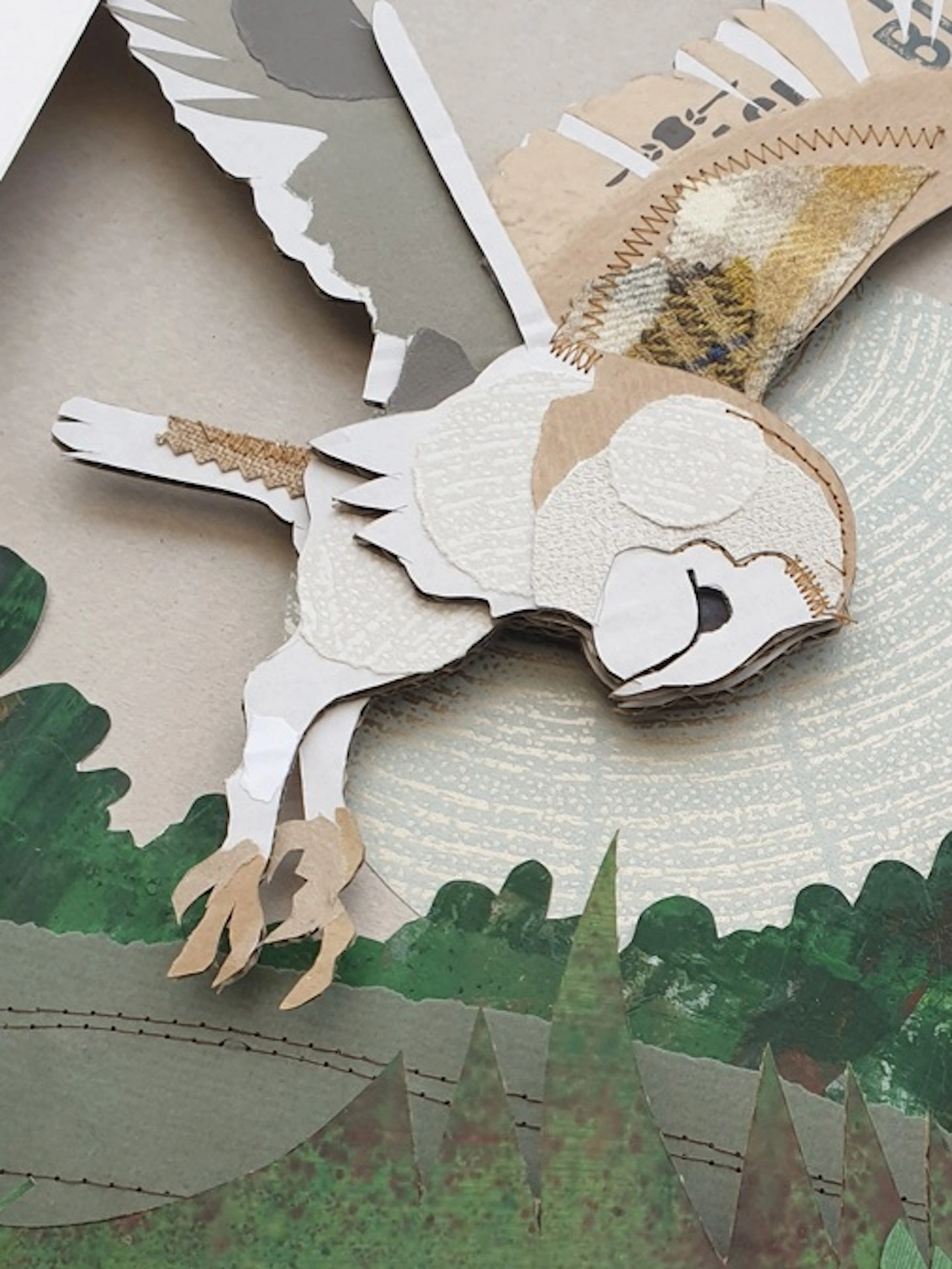 The barn owl, with its ghostly appearance and silent flight, is a fascinating creature of the night. Known for its heart-shaped face and striking white underbelly, this mixed media art piece was created using a wide range of salvaged materials from salvaged tweed scraps to end of season wallpaper samples. Primarily made from corrugated the owl is embellished with paper, recycled buttons, and finished with both machine and hand sewn highlights.