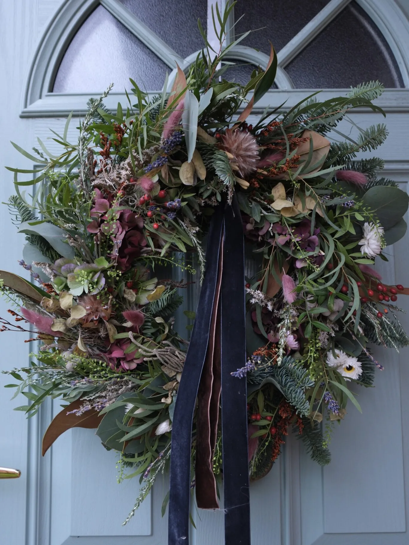 Our ‘Hydrangea Luxe’ wreath is packed with tonal dried florals amongst fresh foliage.