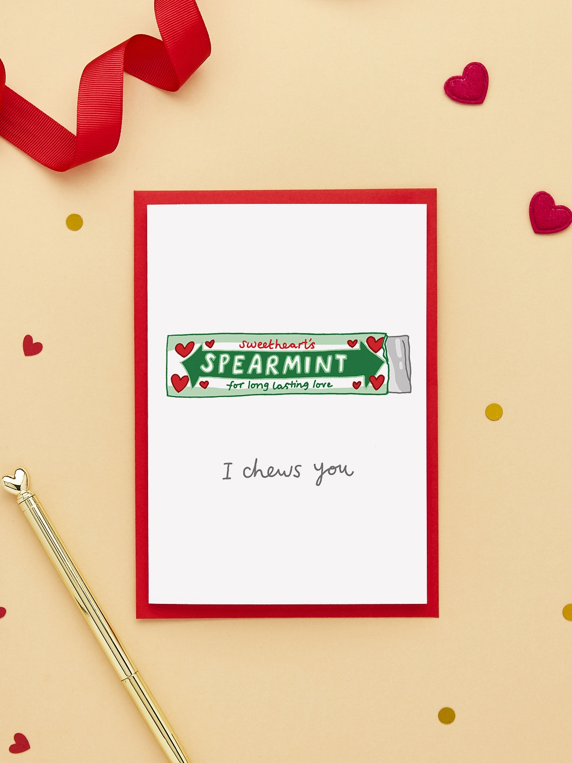 Say it with chew. This bold and playful love card features a hand drawn stick of chewing gum, complete with vintage-style wrapper and a smile. The simple caption "I Chews You" adds a graphic twist to romantic messaging—perfect for Valentine's Day, anniversaries, or just letting someone know they're your top pick.