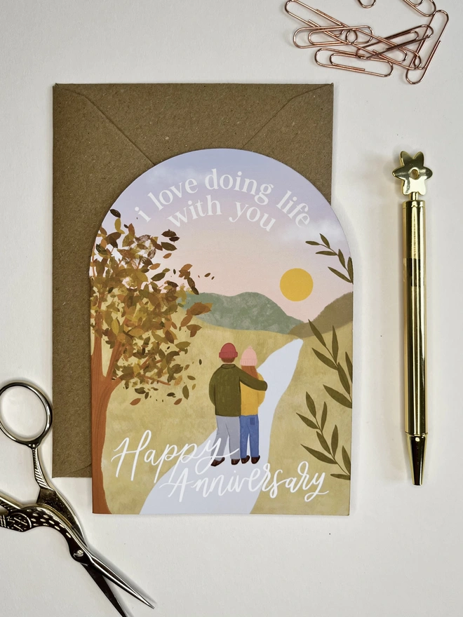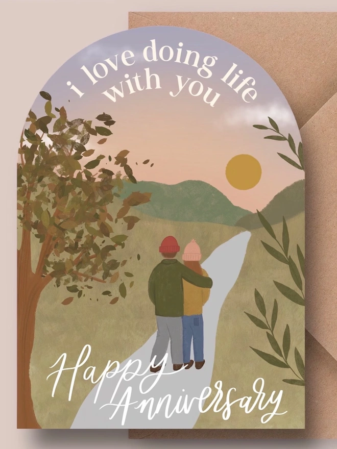 Perfect for marking a special milestone, this romantic anniversary card features a heartfelt design of a couple embracing during a sunset walk, symbolizing deep connection and shared memories. The touching message on the front reads: "I love doing life with you. Happy Anniversary."