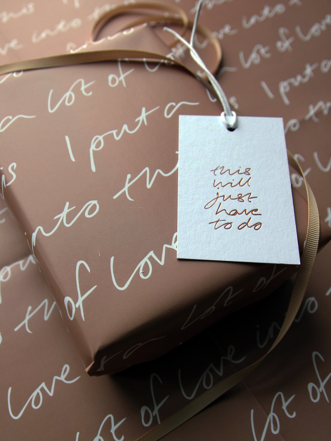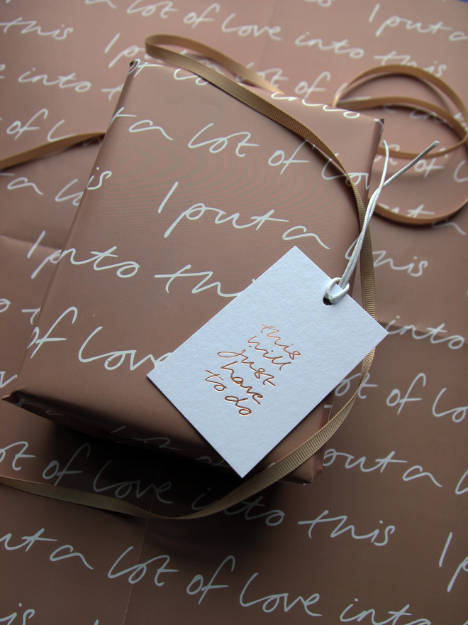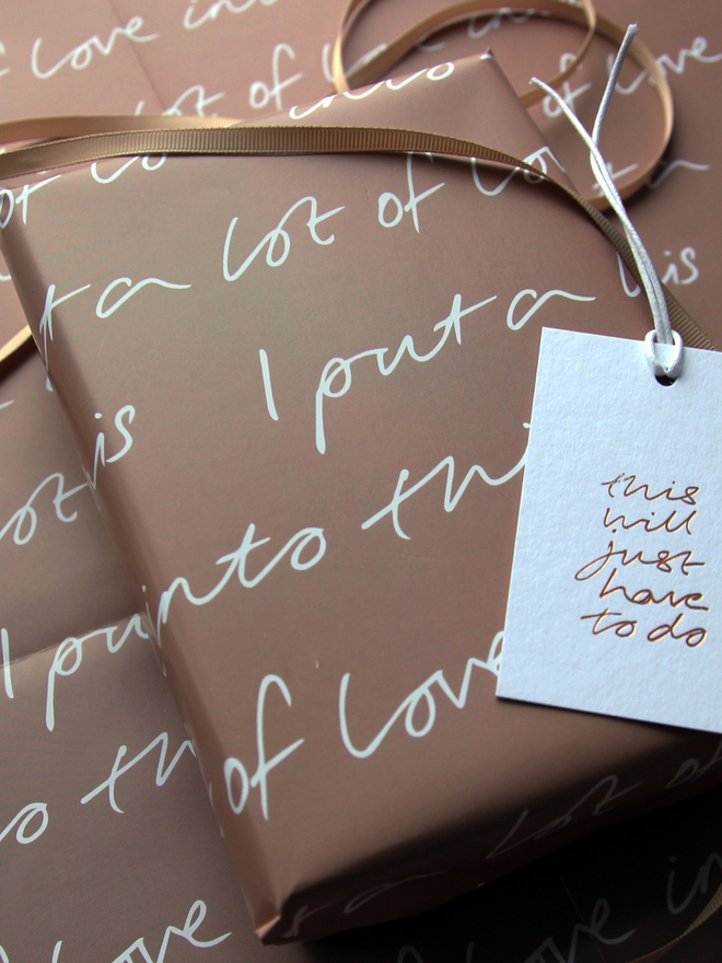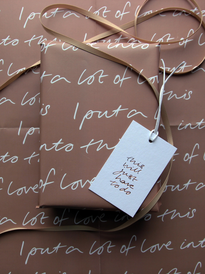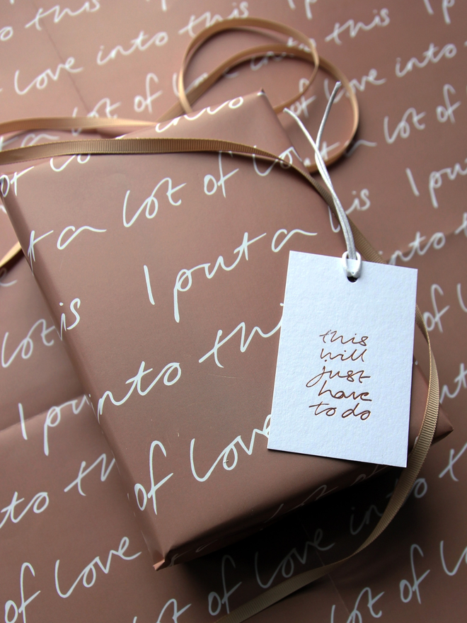 Our “I put a lot of love into this” wrapping paper is proof that presentation is everything. This luxury wrap is ideal for when you’ve spent more time folding corners and sticking tape than actually picking the present. Heartfelt, tongue-in-cheek, and totally giftable.