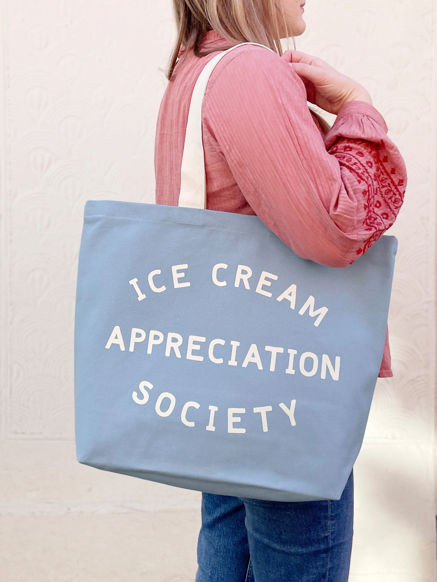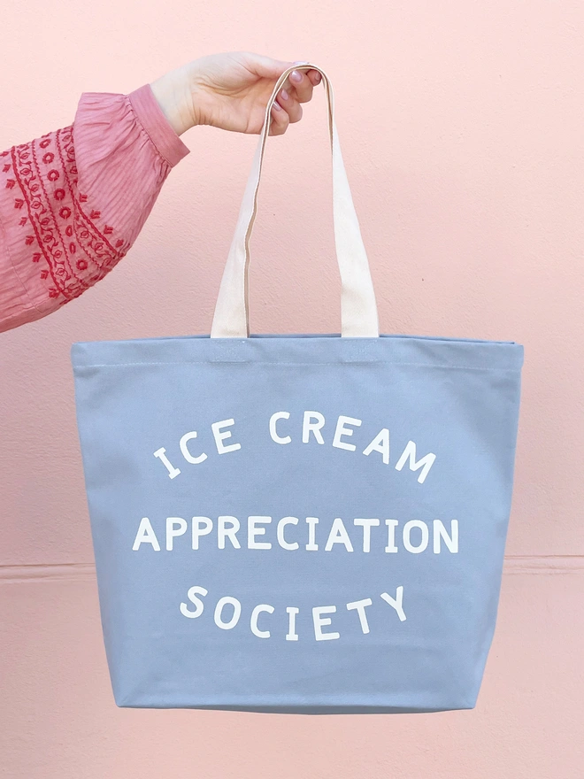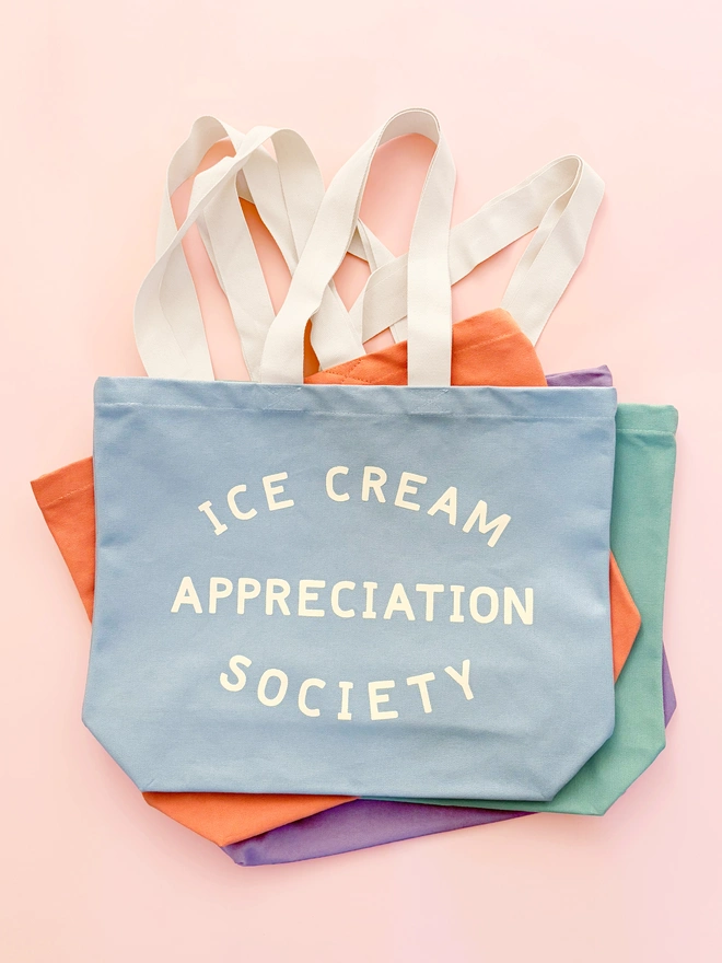 This hand illustrated 'Ice Cream Appreciation Society' design has been printed on sturdy canvas. Available in peach, lavender and sea glass green canvas.