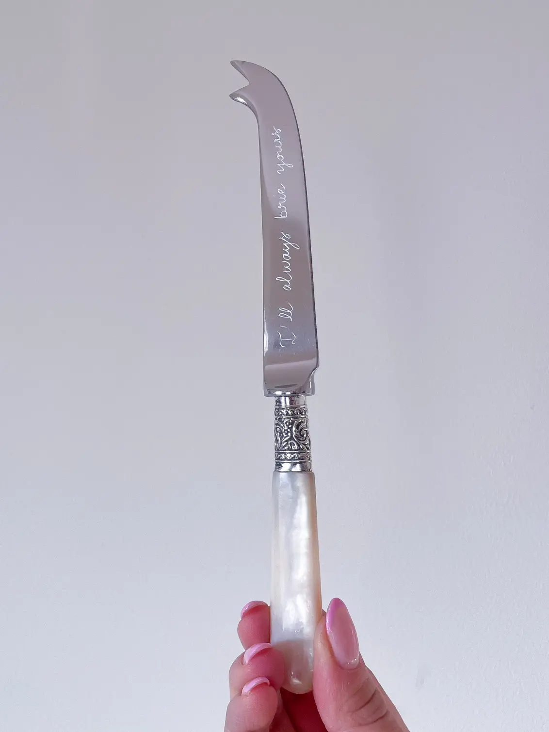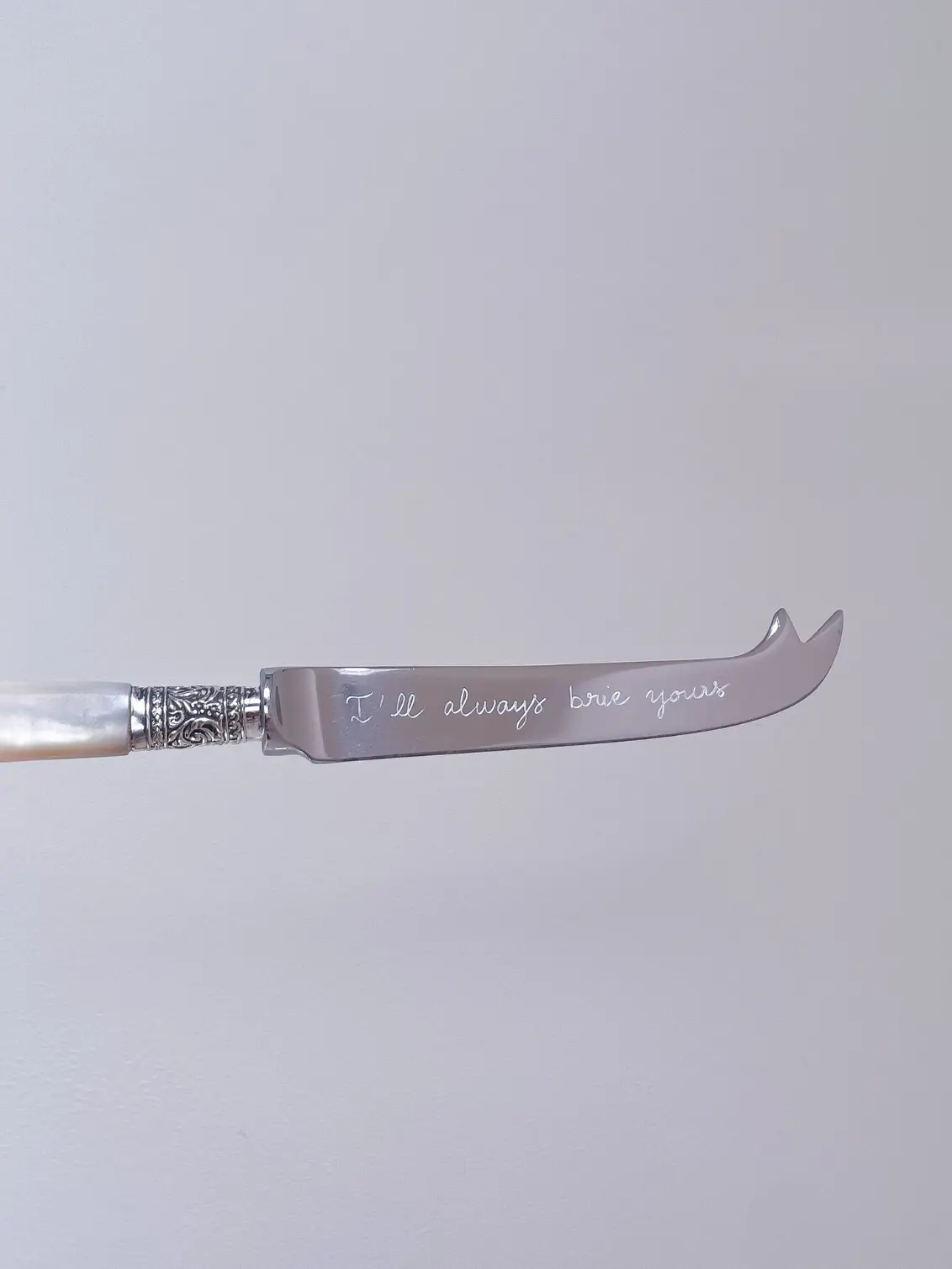 Cheese knife with a real vintage mother of pearl handle, hand-engraved with the words "I'll always brie yours" on the stainless steel blade