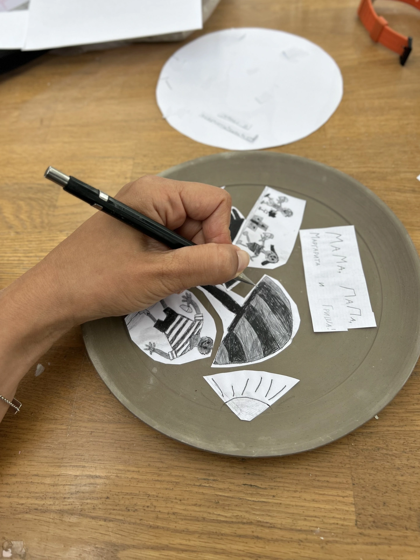 Using a copy of the original drawing, the illustration is carefully traced by hand onto the handmade ceramic surface.