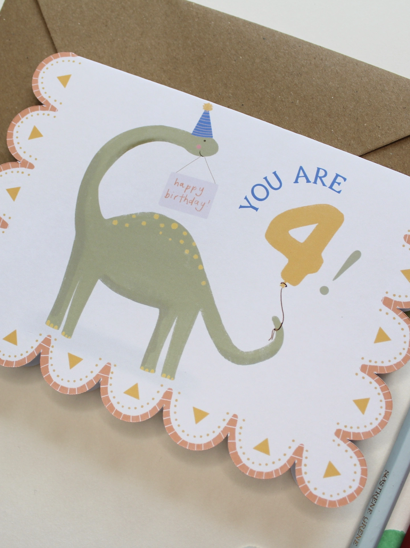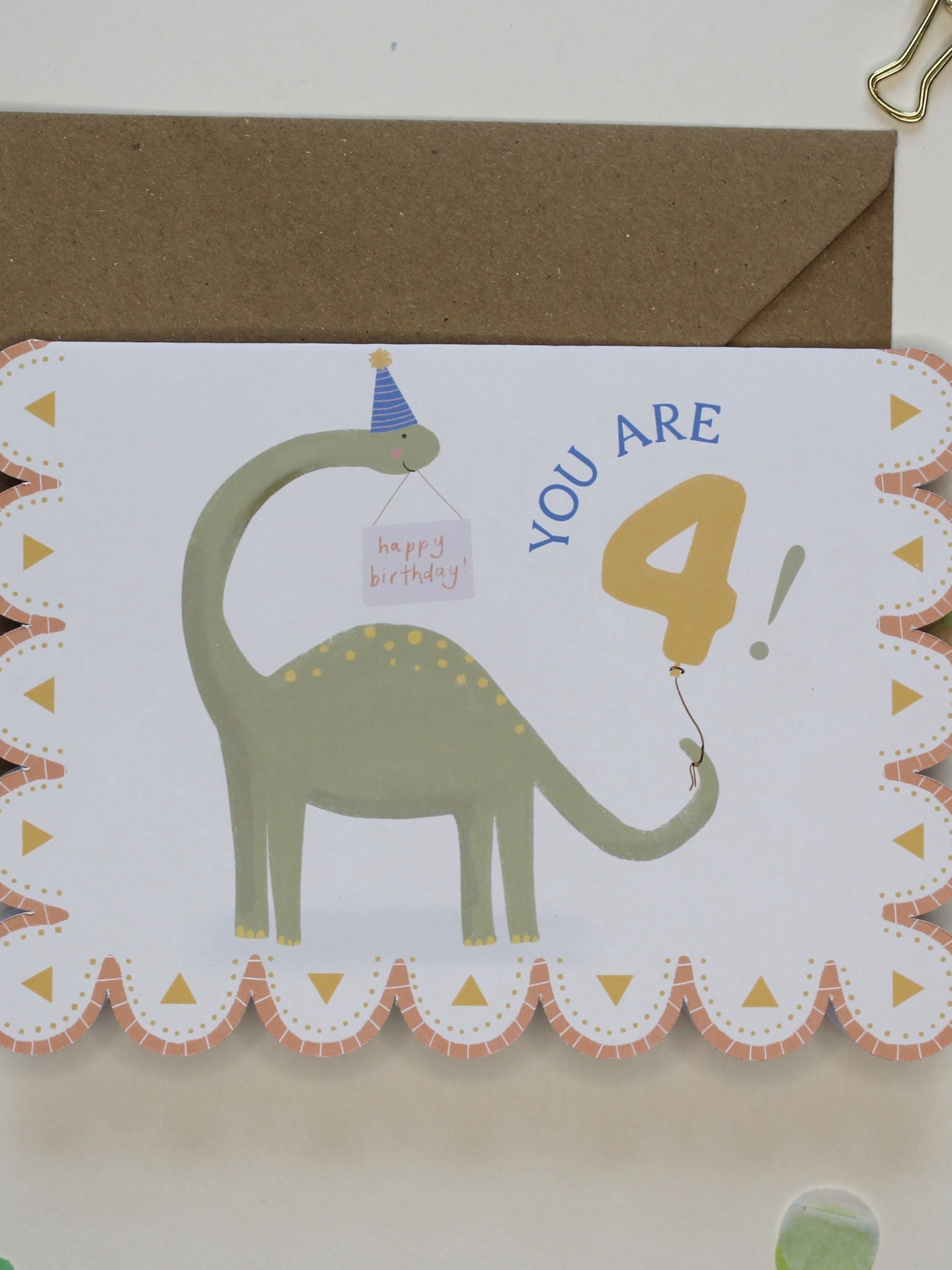 Help your little one have a roar-some third birthday with this one of a kind, colourful dino card! Featuring a dinosaur ready to celebrate with a party hat and number 4 balloon. This unique card has a fun scalloped edge that makes it stand out and is perf...