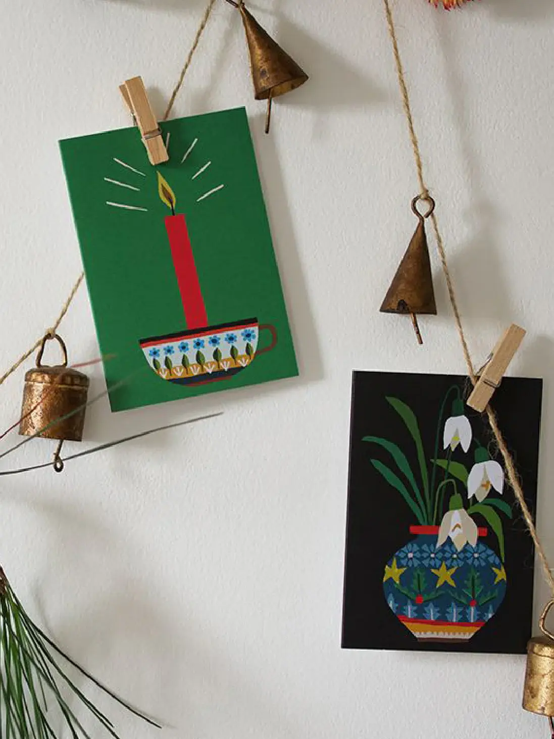 Six cards with two designs in each pack - choose from 'festive candle and snowdrops', 'bauble and mistletoe', 'winter bunch and Christmas jug', 'ivy and holly' or 'Christmas pine and winter rosehips'.