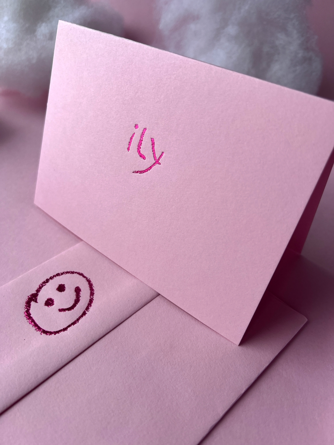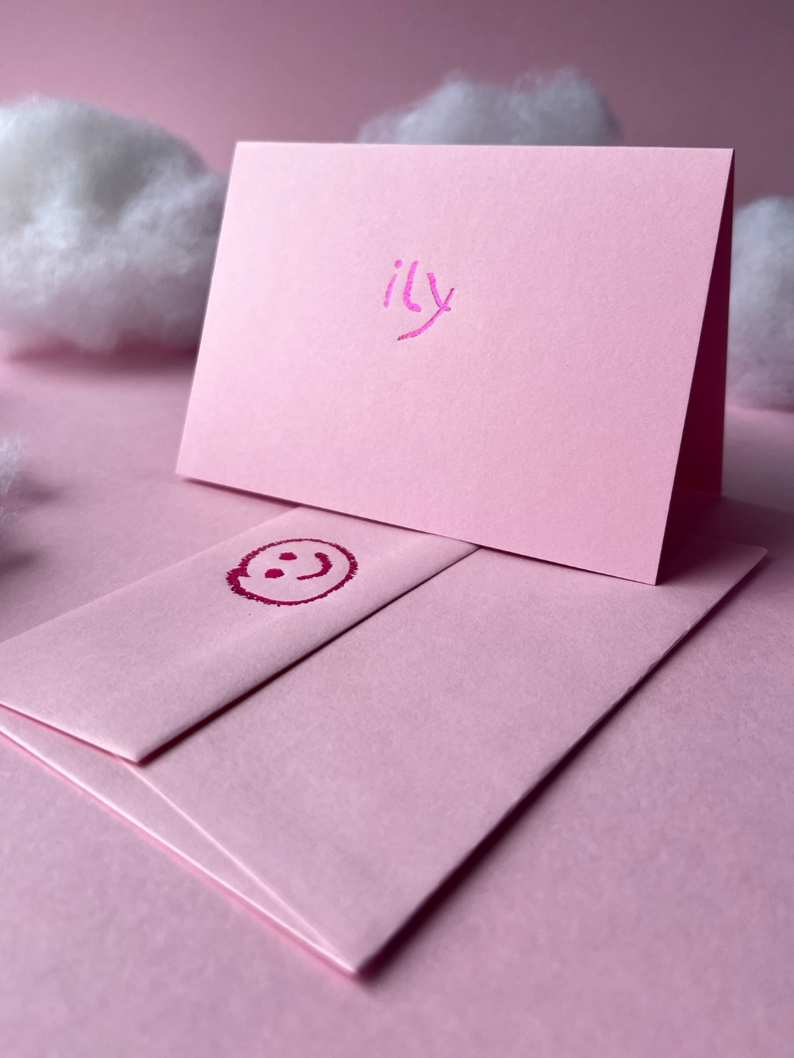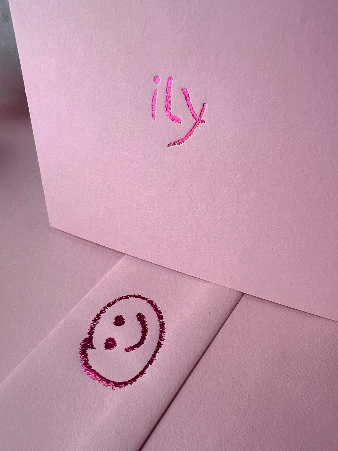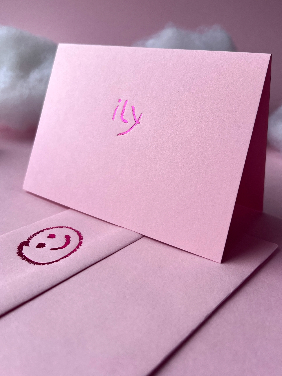 Short, powerful, and straight to the point: ily. The sweetest way to say “I love you”, whether it’s romantic, family, or just bestie vibes. Foiled on candy pink coloured paper with shiny metallic detail and a smiley face foiled on the envelope.