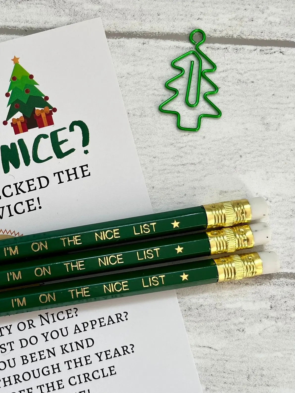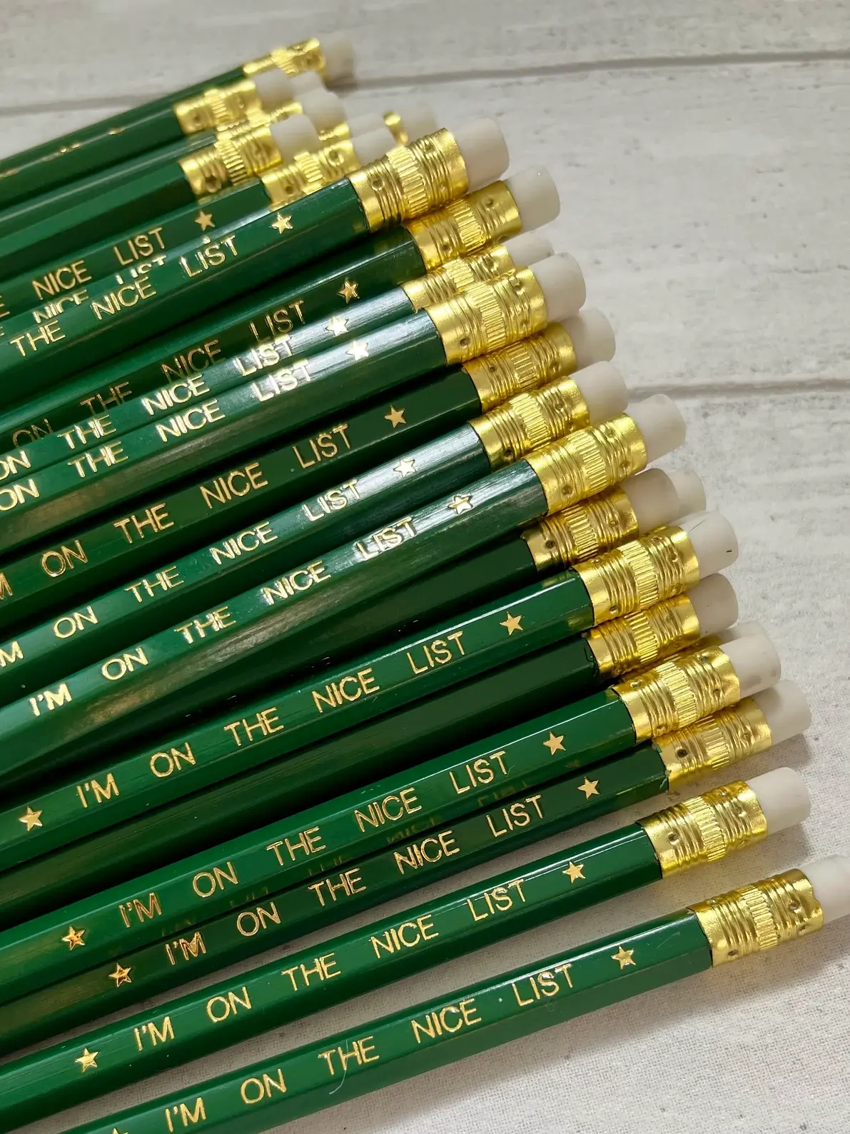 Looking for a HB pencil to write your list to Santa, then look no further. These Holly Green hexagonal HB pencils are hand stamped with the text, 'I'M ON THE NICE LIST' with a star each side of the text in gold foil with matching gold ferrule and white er...