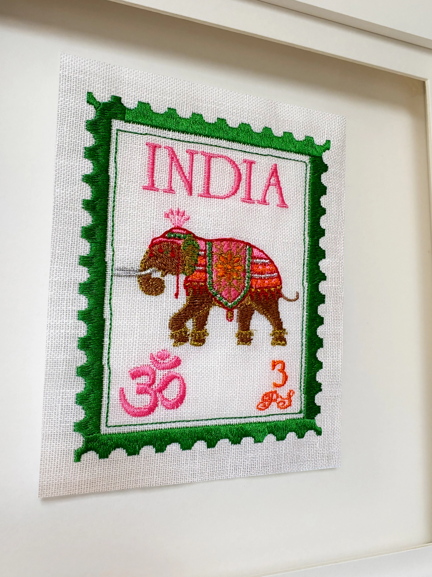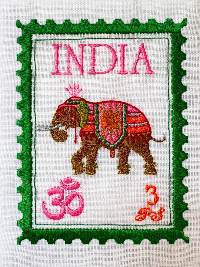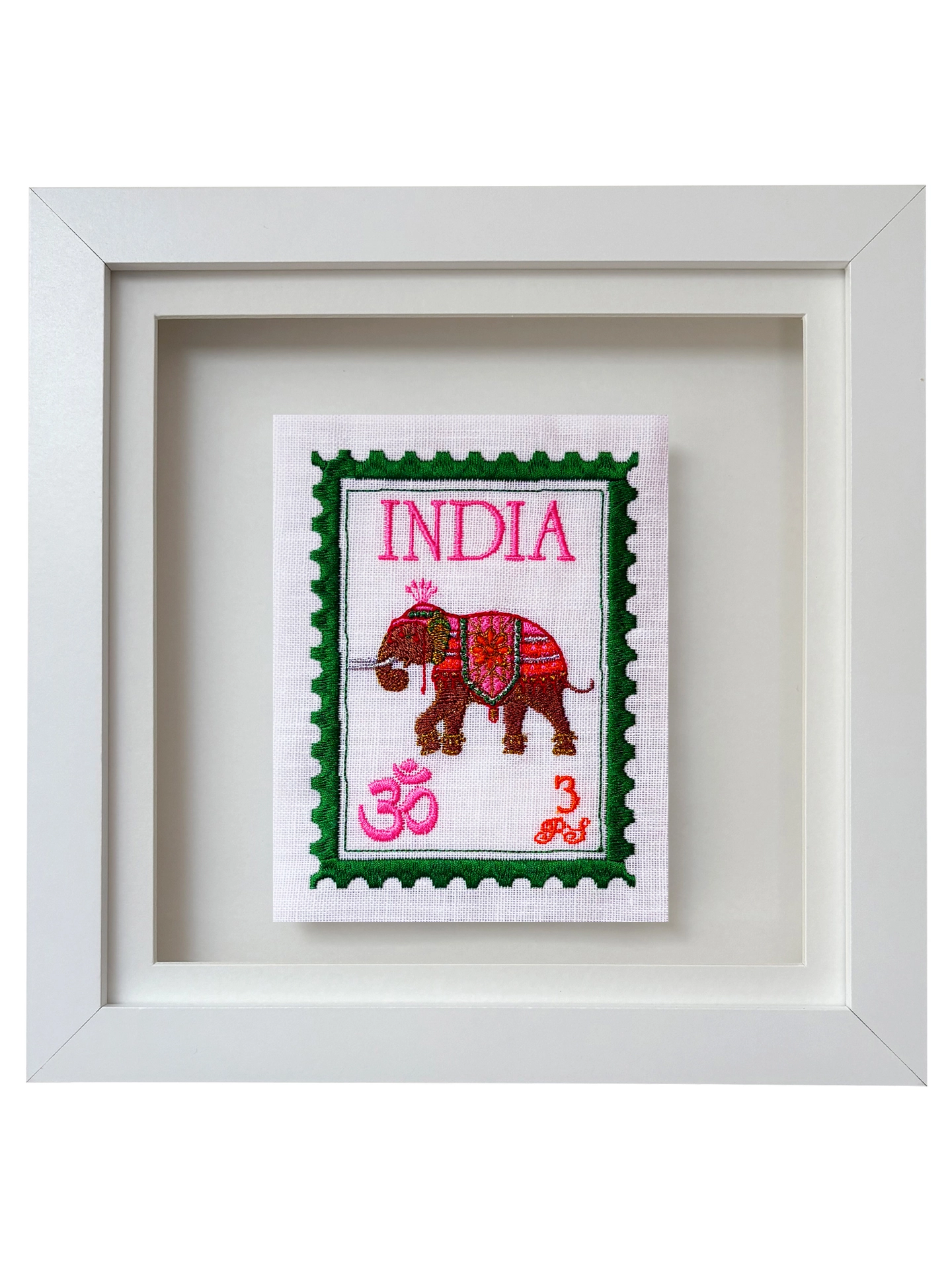 I wanted to create a range of unique embroidered stamps from all over the world, inspired by India; these are bright and fun with a playful twist. We stitch all of these in our London studio and use beautiful floating frames.