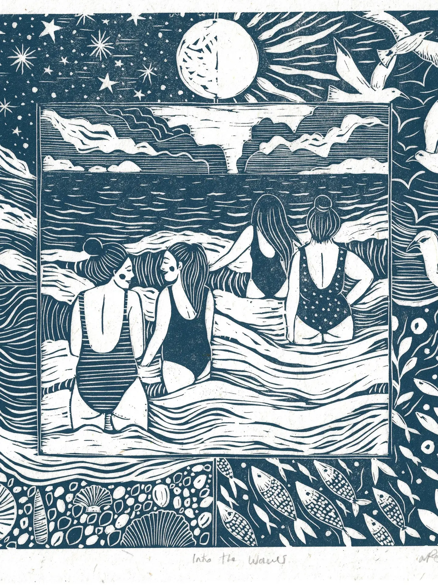 Original linoleum print in a vignette style design depicting women entering a wavey sea as the main image, with 4 separate detailed border images that form one big scene...