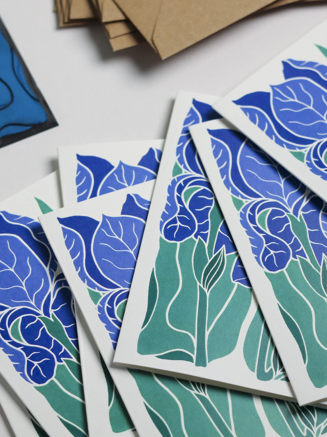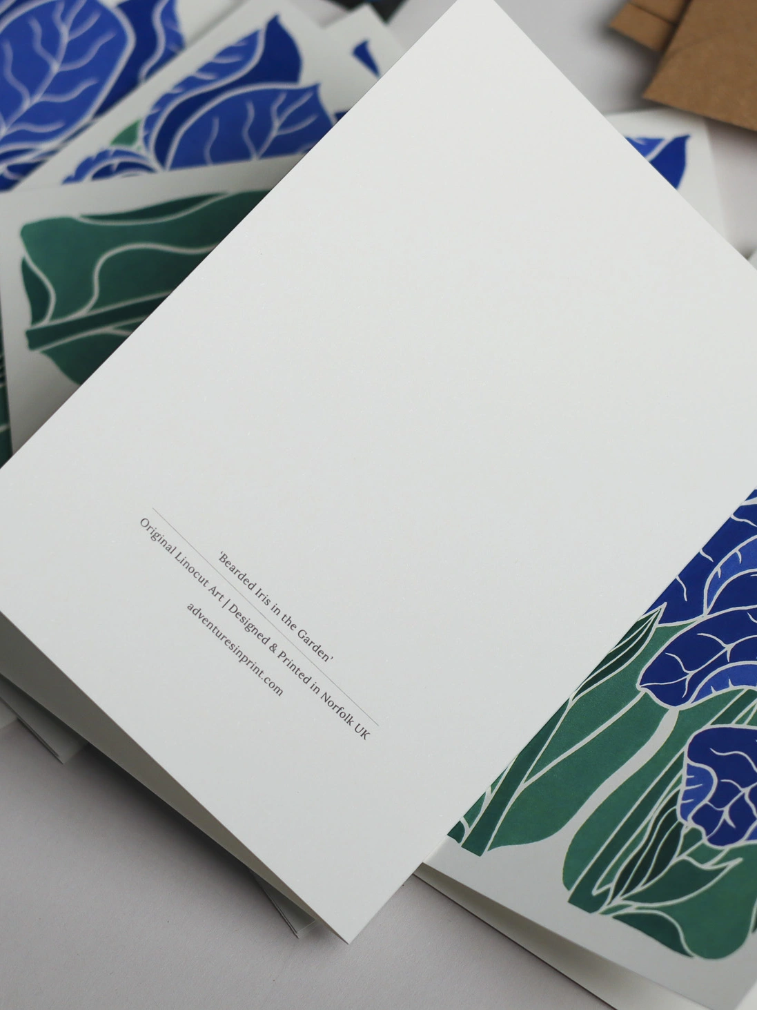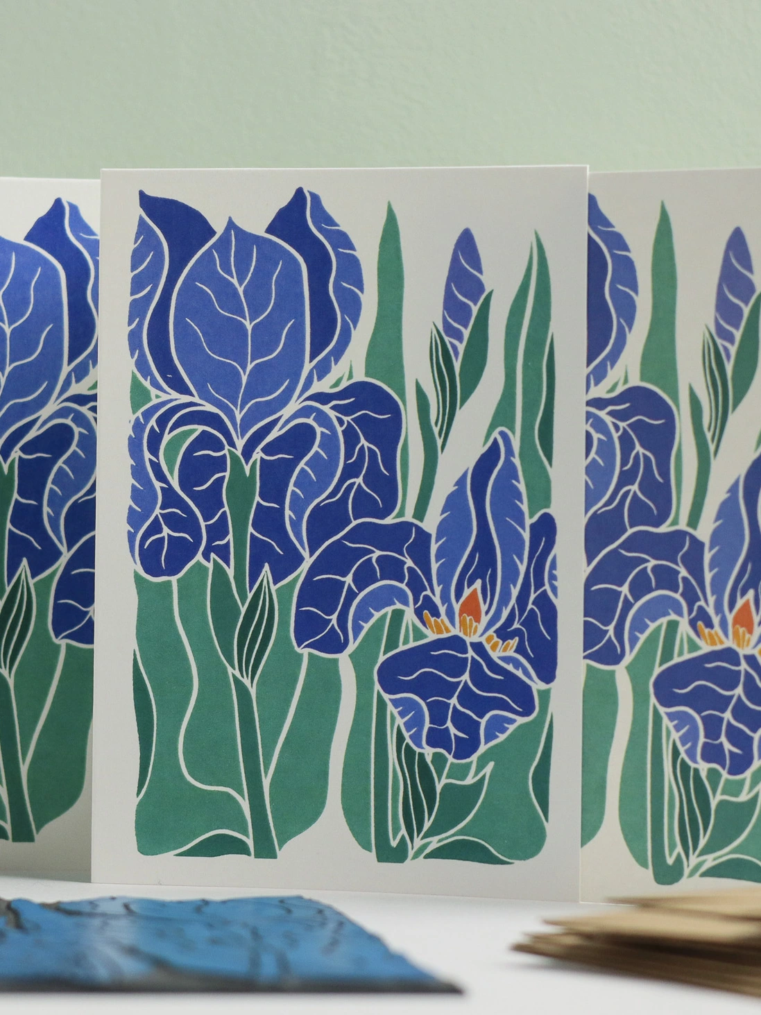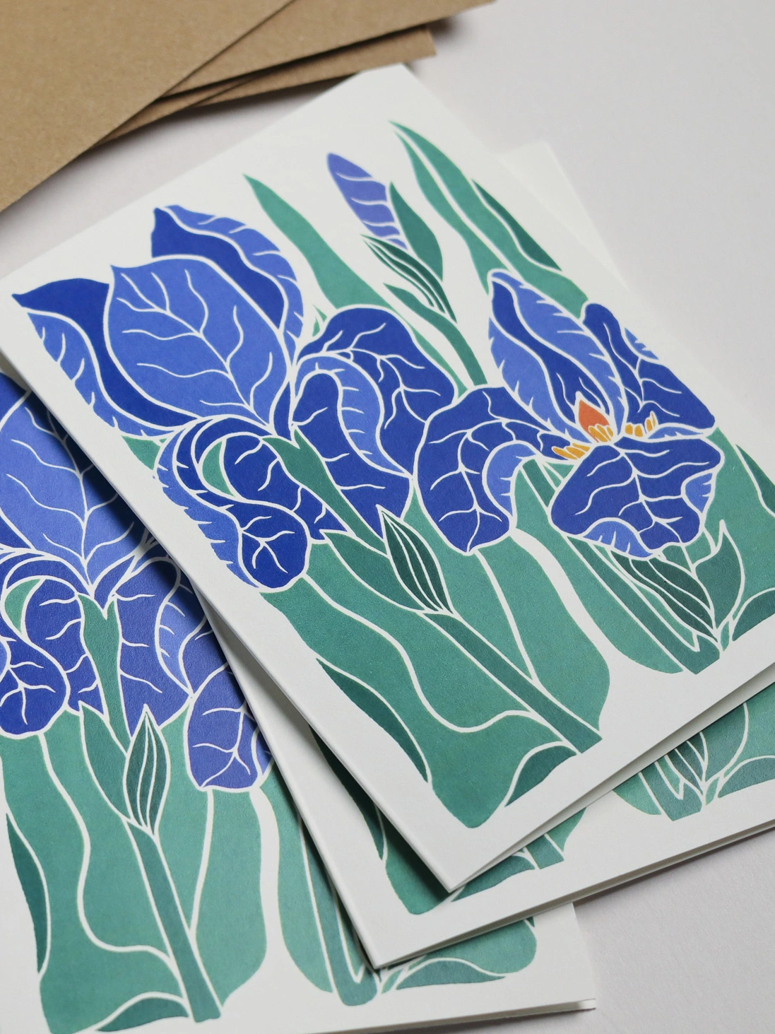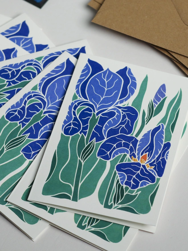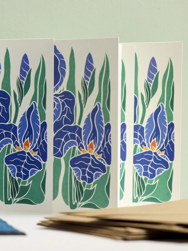 Sculptural petals in classic blue-purple with golden beards - the iris of cottage garden borders and carefully tended plots. Sculptural, elegant, unmistakably iris. This original linocut design captures their dramatic form in traditional blues and golds. These botanical notecards are perfect for heartfelt correspondence, thank you notes, or elegant invitations. Each design begins as a hand-carved linocut print from my Norfolk studio - traditional relief printmaking meeting contemporary colour, created with real carving tools, real linoleum, and real patience.