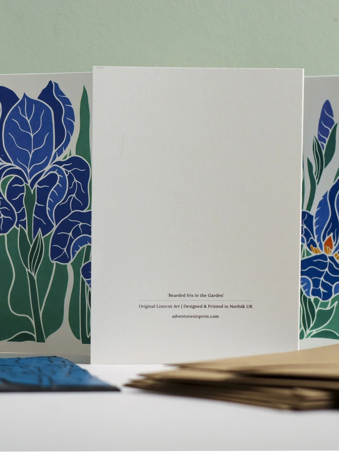 Sculptural petals in classic blue-purple with golden beards - the iris of cottage garden borders and carefully tended plots. Sculptural, elegant, unmistakably iris. This original linocut design captures their dramatic form in traditional blues and golds...