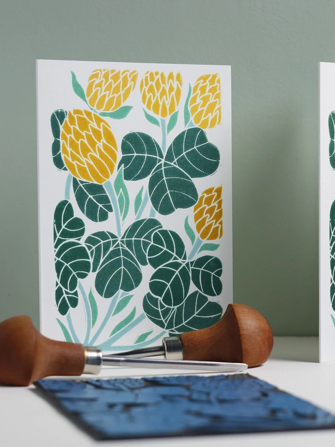 A joyful celebration of Ireland's beloved shamrock, hand-carved in my Norfolk studio. Distinctive trefoil leaves in rich greens crowned with cheerful golden clover heads that dance across the design. Each leaf vein and flower carefully carved using traditional printmaking, then brought to life with vibrant digital colour. Perfect for St Patrick's Day, celebrating Irish heritage, or sharing a bit of the Emerald Isle's natural charm.