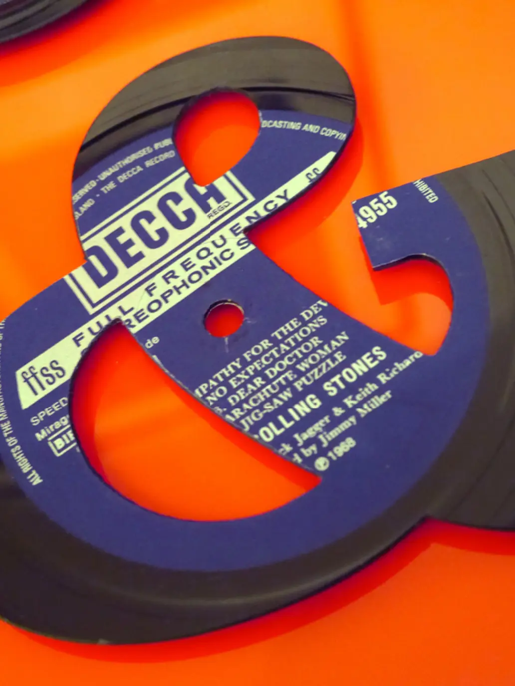Original 7" and 12" Rolling Stones vinyl records cut and arranged in a perspex case.
