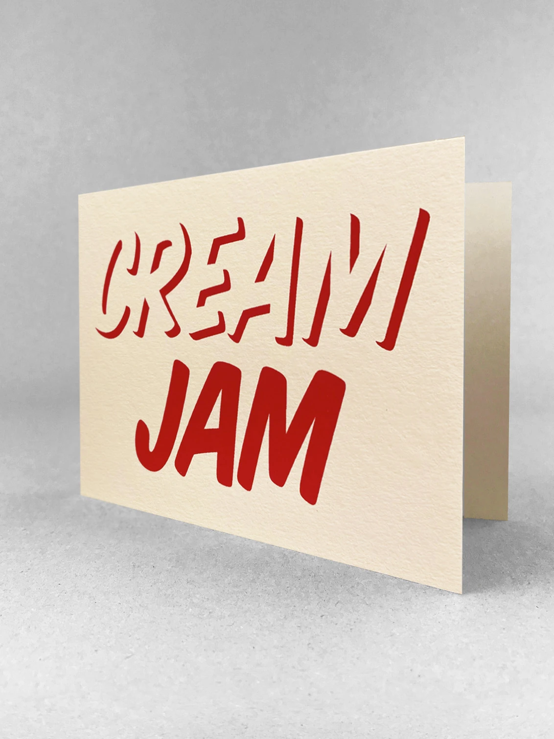 Cleanly printed type in strawberry red ink on a cream coloured recycled card stock, reading JAM with CREAM on top! This is the Cornish order for cream tea should you be in any doubt, spread a spoonful of jam on the scone then dollop the cream on top. Once...