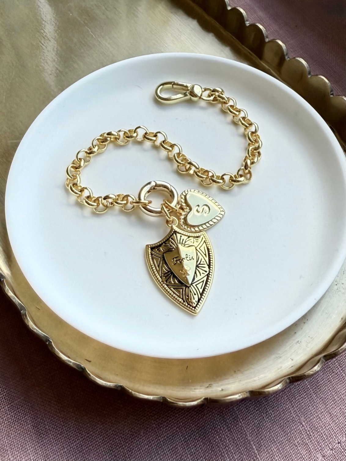 Carefully crafted and etched with the word Fortis, Latin for brave, this wonderful gold shield charm hangs from a belcher chain bracelet and is finished with a chunky, gold clasp.