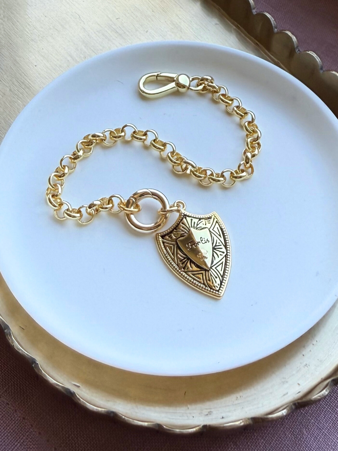 Charms and chain 18ct gold plated on brass, bracelet length adjustable up to 20cm, shield charm 25mm