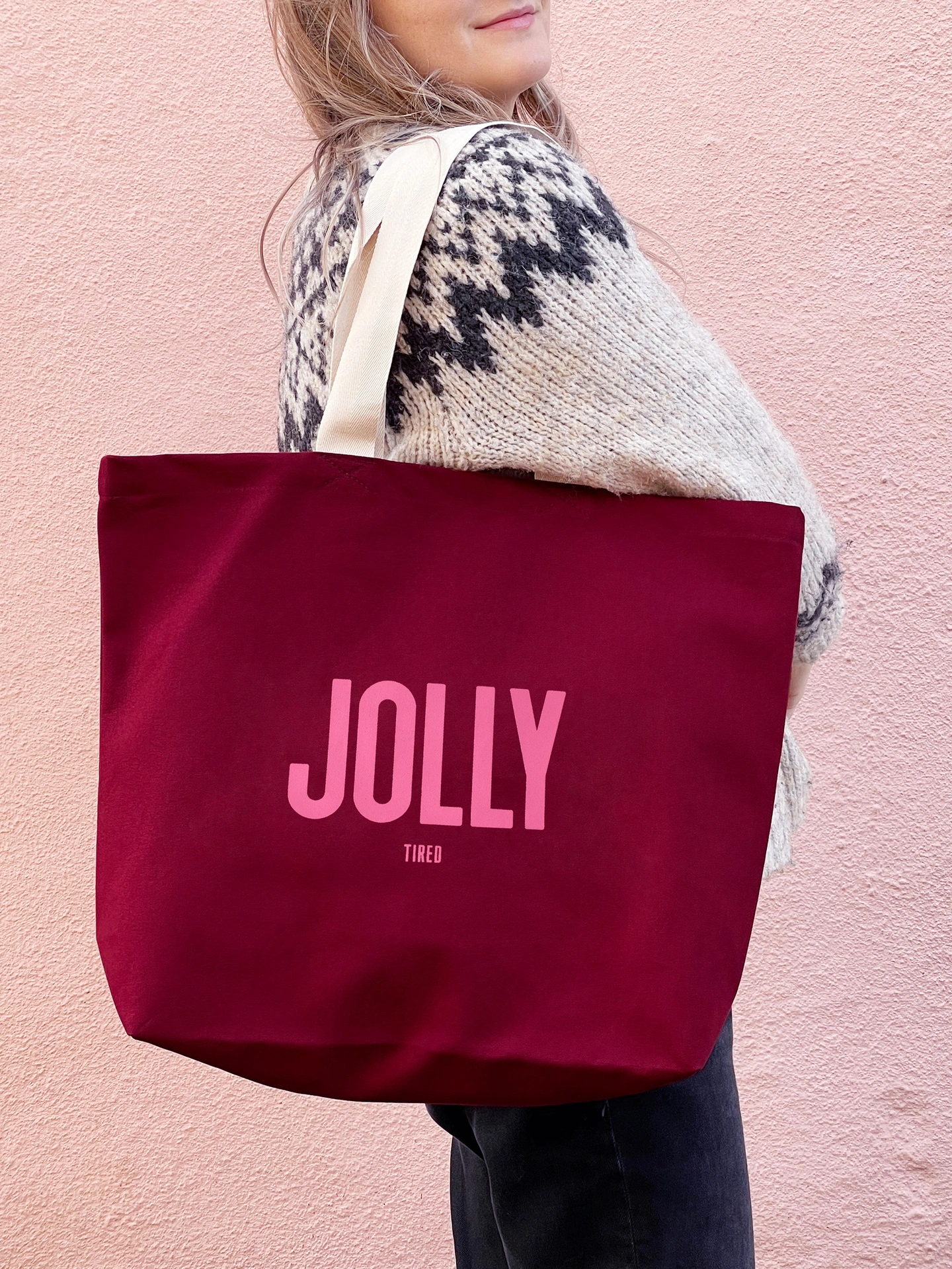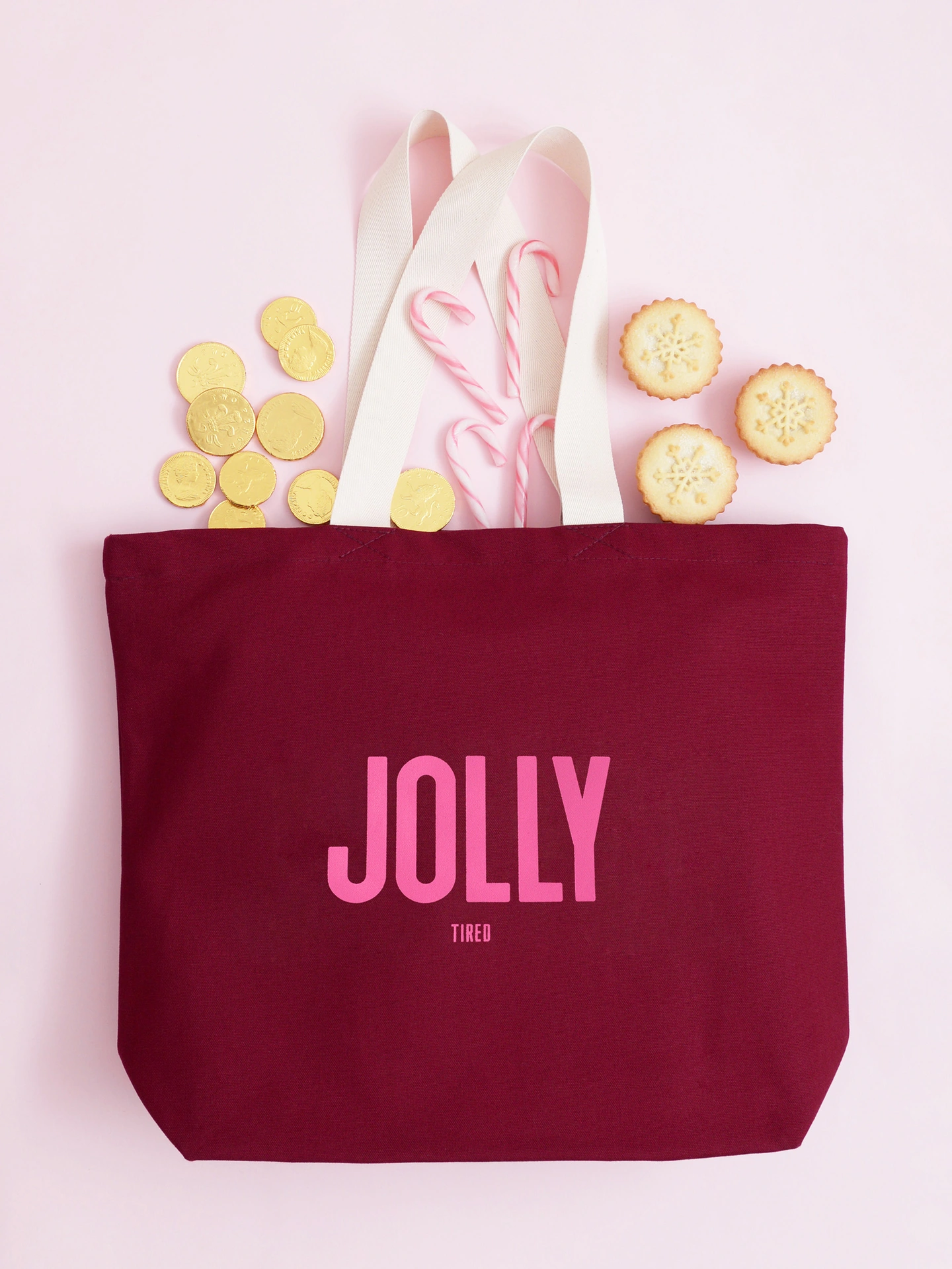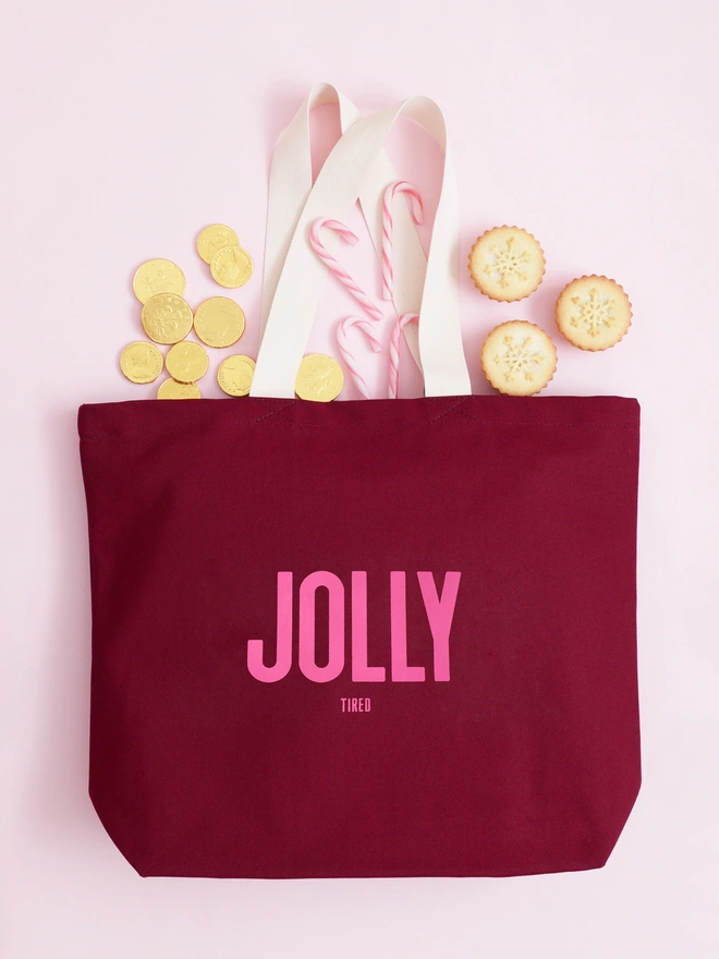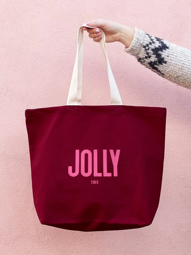 Featuring bold pink lettering that reads "JOLLY" with a cheeky little "TIRED" underneath, this tote captures the true spirit of the season - joyful, but a little worn out too.
