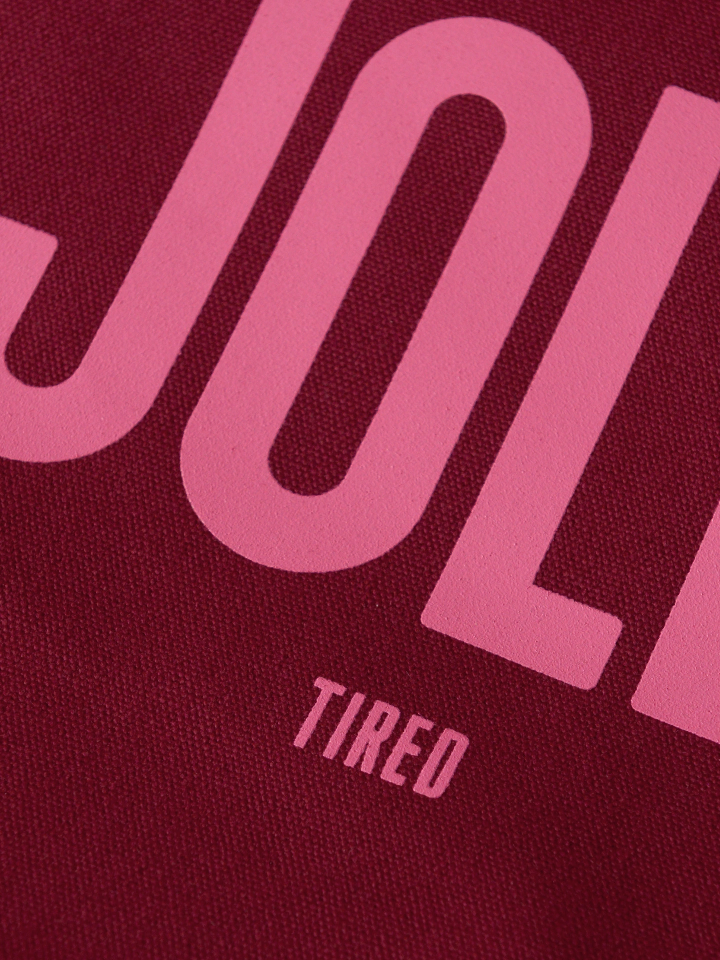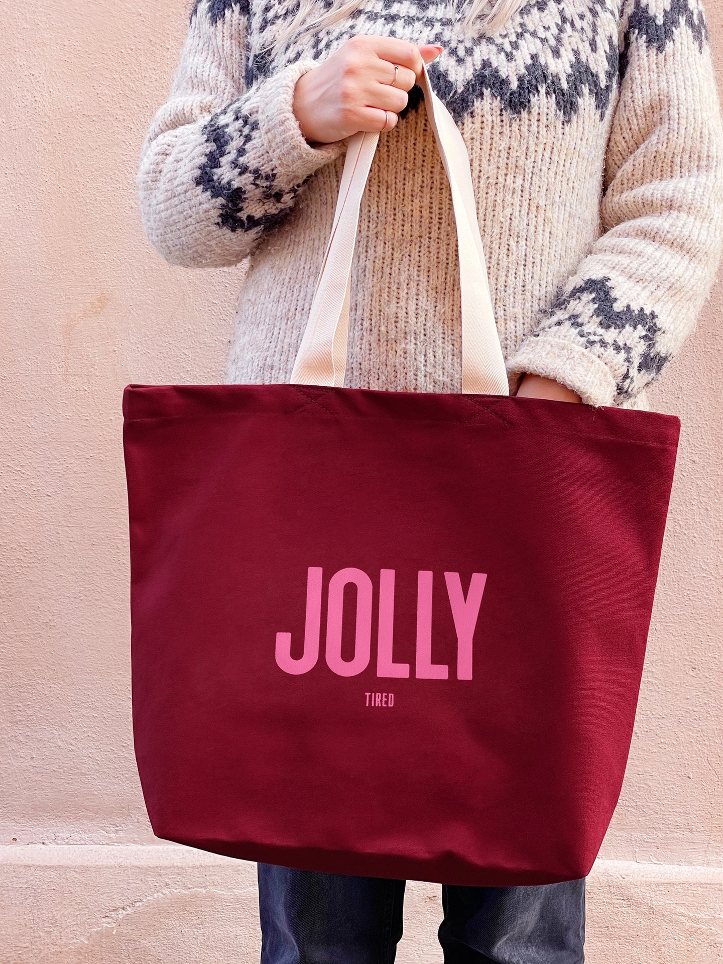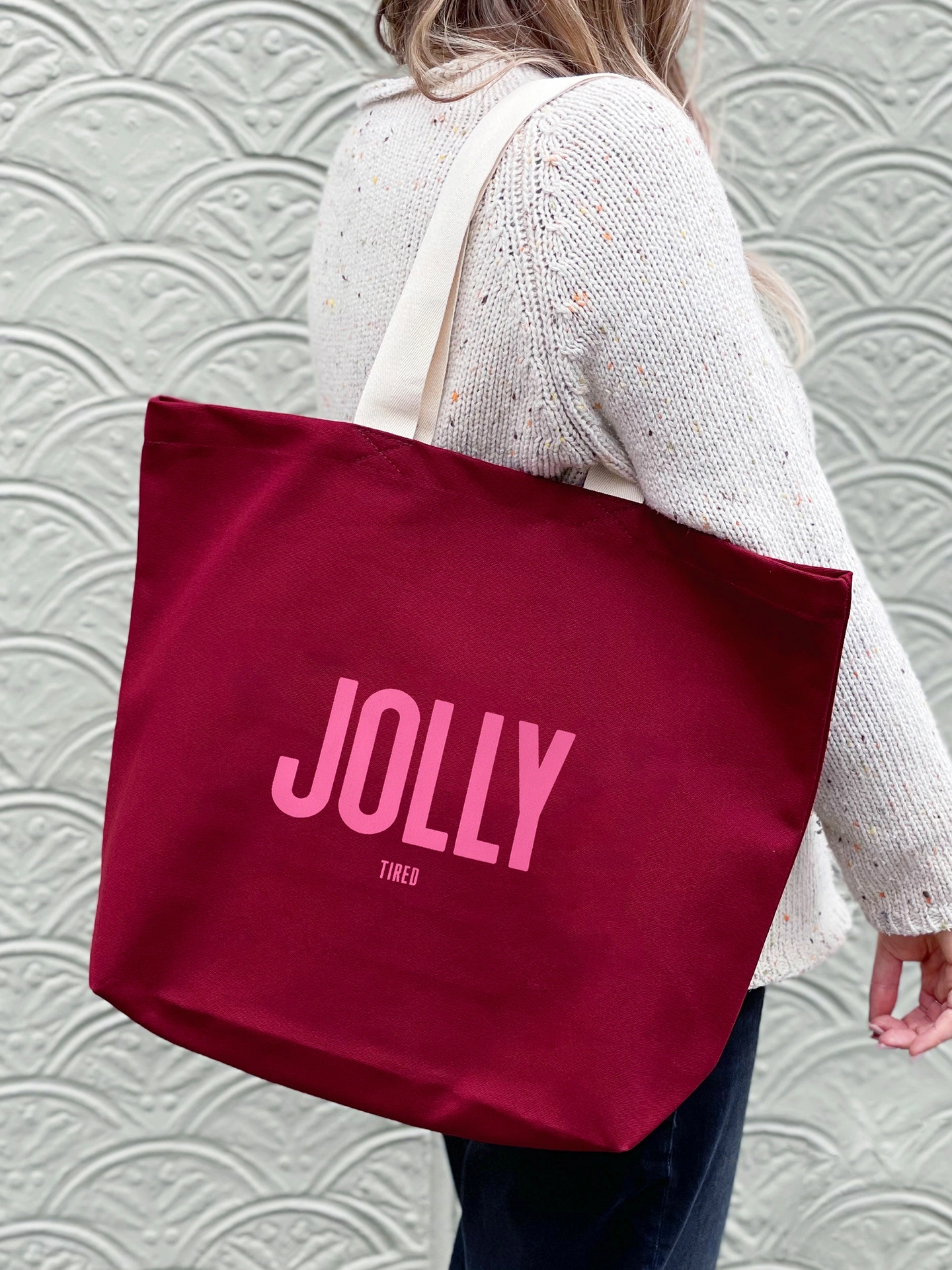 Featuring bold pink lettering that reads "JOLLY" with a cheeky little "TIRED" underneath, this tote captures the true spirit of the season - joyful, but a little worn out too.