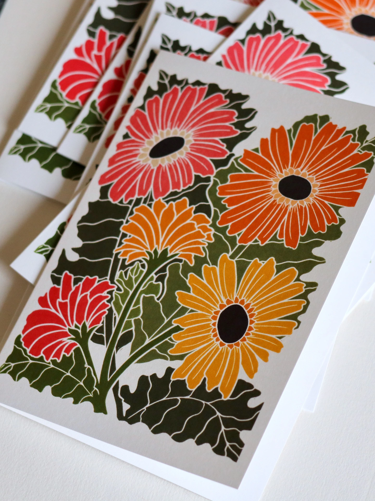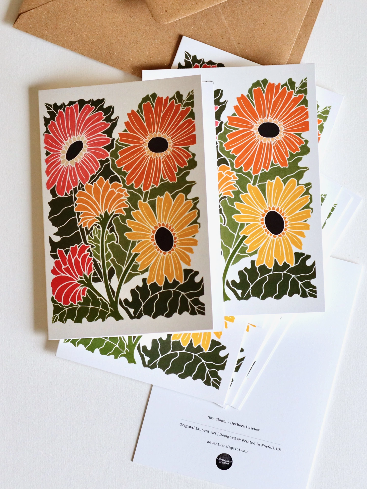 A set of 8 linocut Gerbera daisy notecards. Part of the Joy Bloom collection, 'Gerbera Daisies' is an original linocut design featuring a bunch of colourful blooms in an uplifting and cheerful range of colours; pinks, oranges and yellow. Gerbera daisies,...
