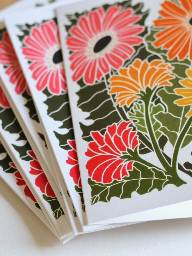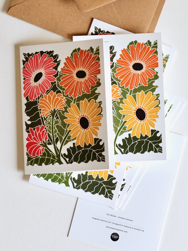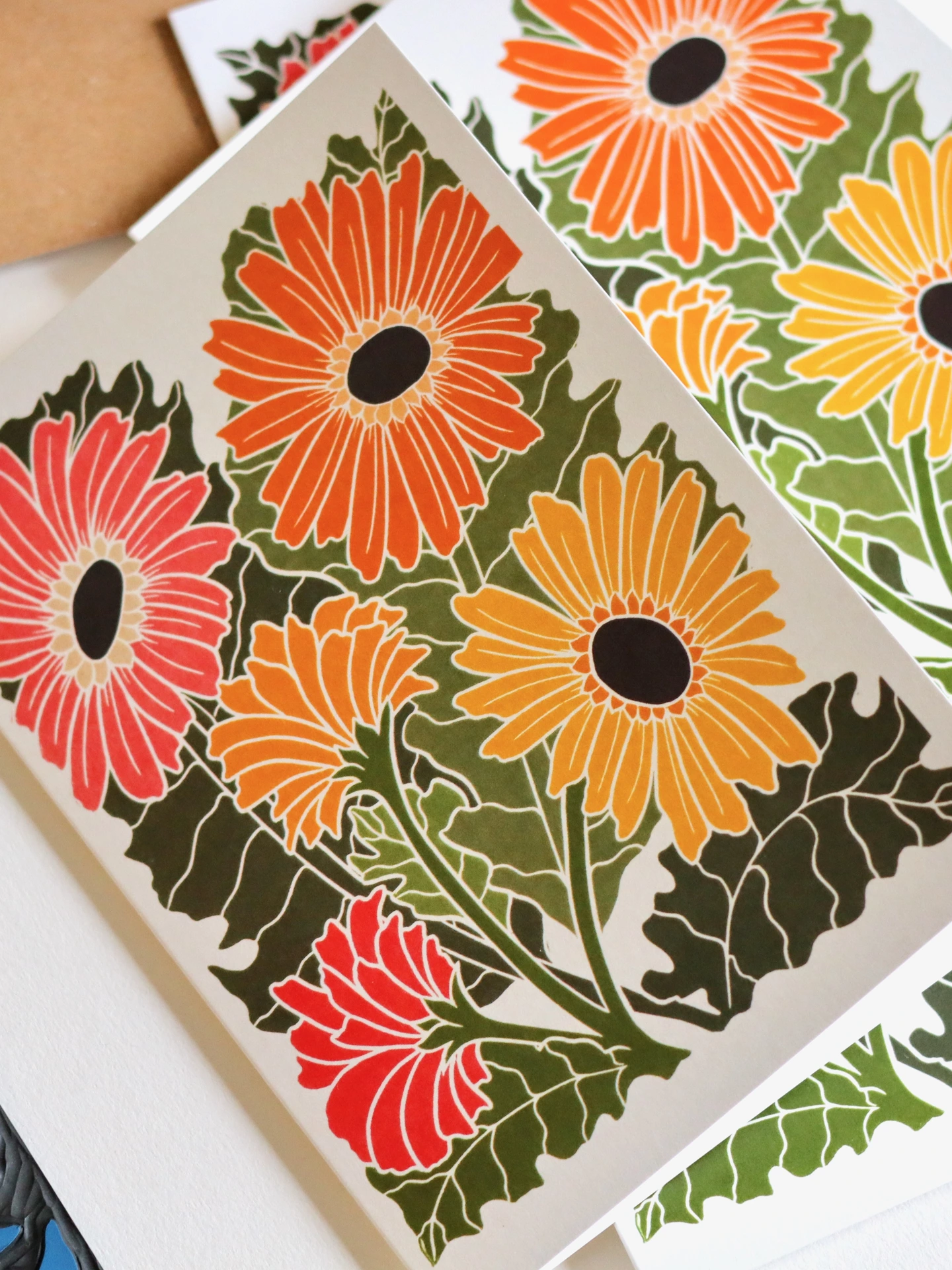 A set of 8 linocut Gerbera daisy notecards. Part of the Joy Bloom collection, 'Gerbera Daisies' is an original linocut design featuring a bunch of colourful blooms in an uplifting and cheerful range of colours; pinks, oranges and yellow. Gerbera daisies, like joy can be simple, bright, and wonderfully accessible. It can arrive in any colour, fit in any space, and bring light to any moment.
