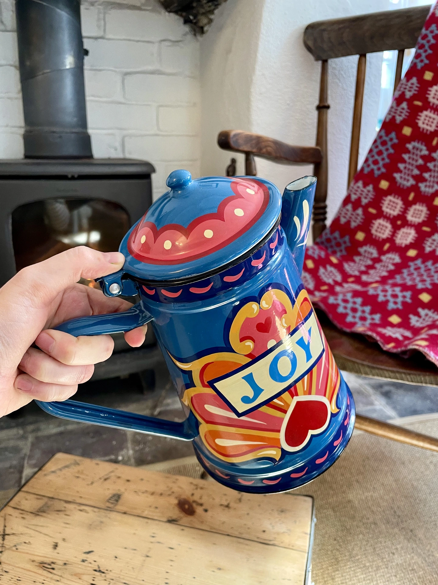 Add a burst of colour and fairground fun to your home with this piece of hand-painted vintage enamelware, designed exclusively for Holly & Co. Featuring a double sided design inspired by traditional fairground artwork, and painted using traditional signwriting techniques, this vintage enamel coffee pot can be used either as a decorative item, or to pour the coffee (at the discretion of the drinker)!