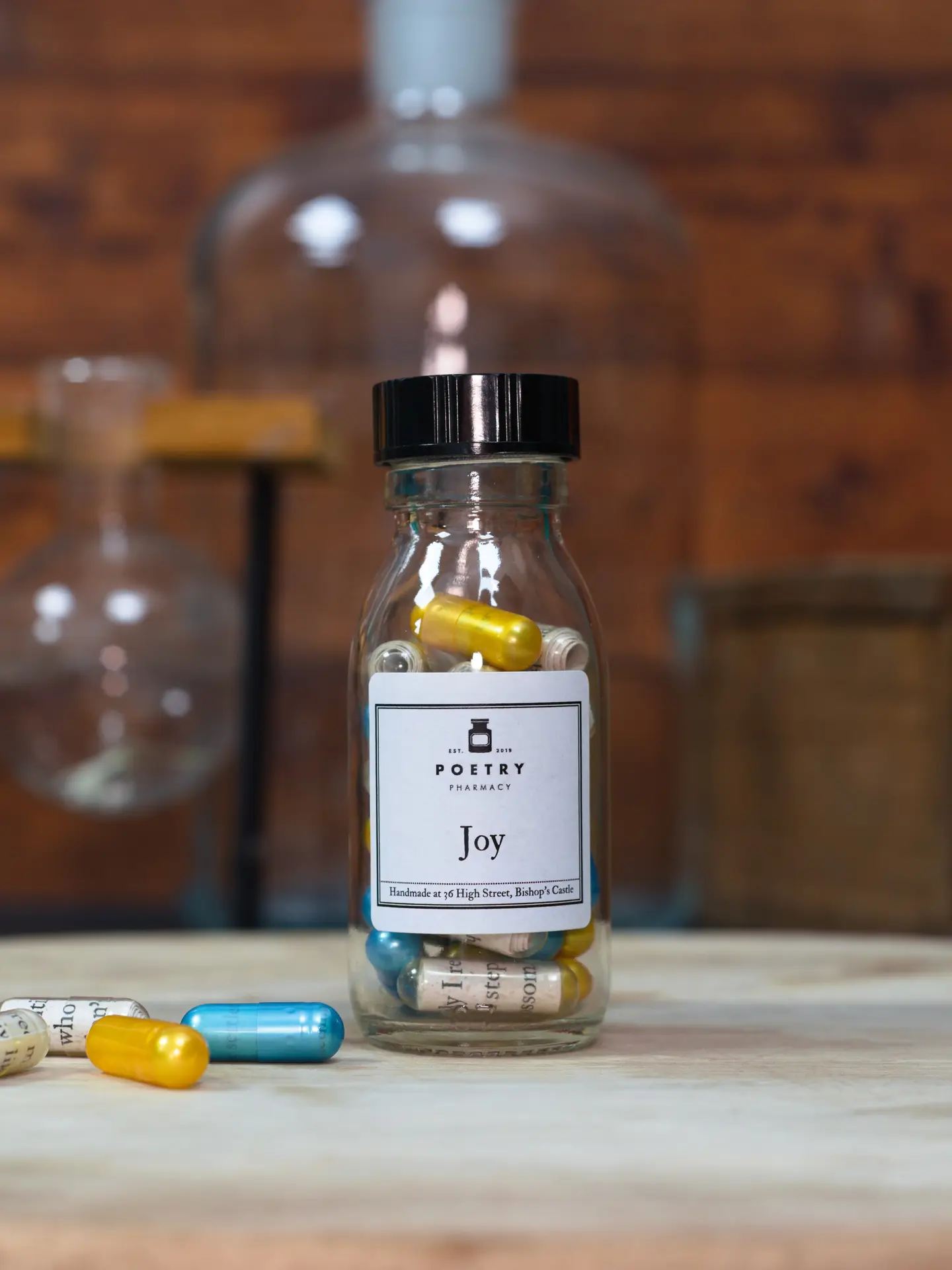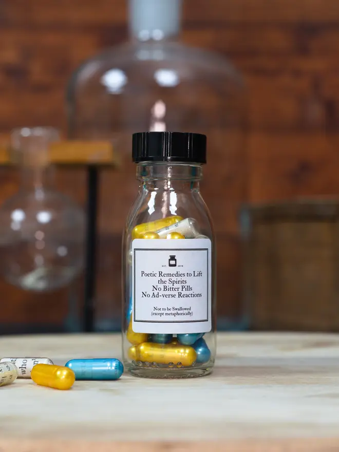 The glass bottle contains approx 26 pill capsules, each containing lines of poetry on banana-paper.
