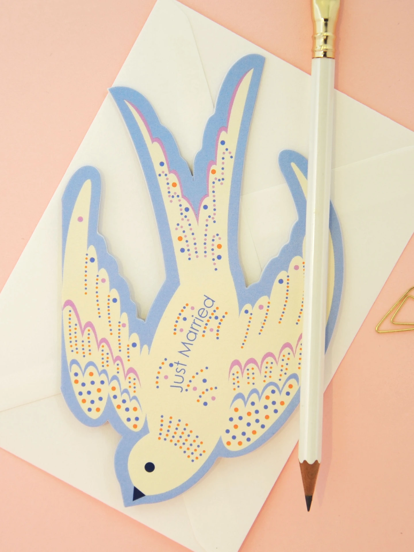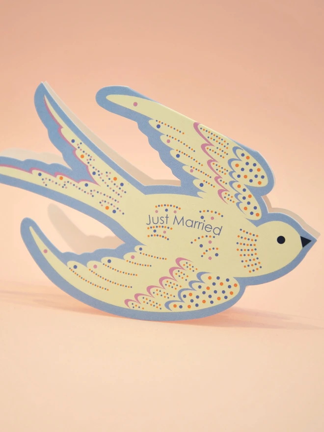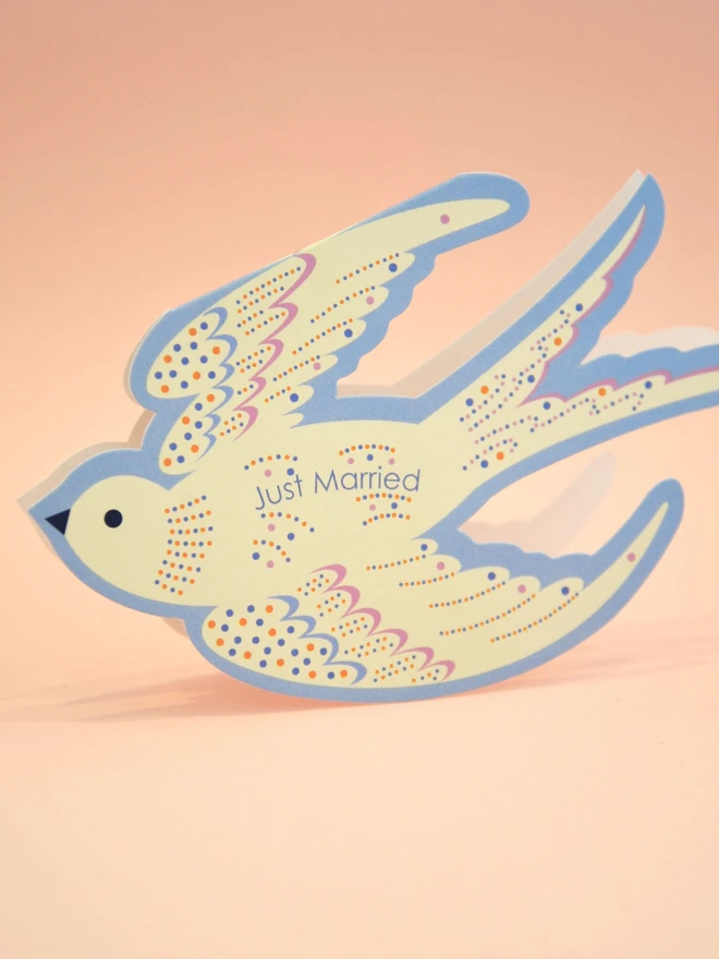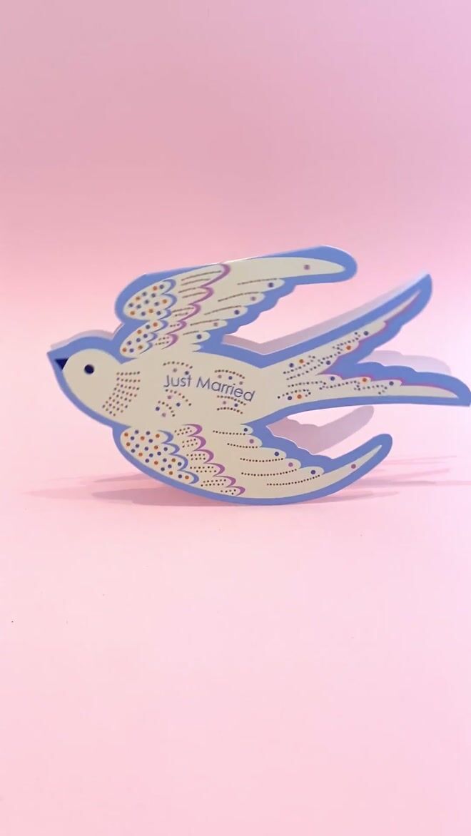 Celebrate love and new beginnings with this beautifully crafted Just Married card, featuring a unique die cut rocking bird design. Its clever rocking design makes it more than just a card. Printed in soft blue with playful orange and lilac accents, it’s more than just a greeting, it’s a keepsake to treasure.