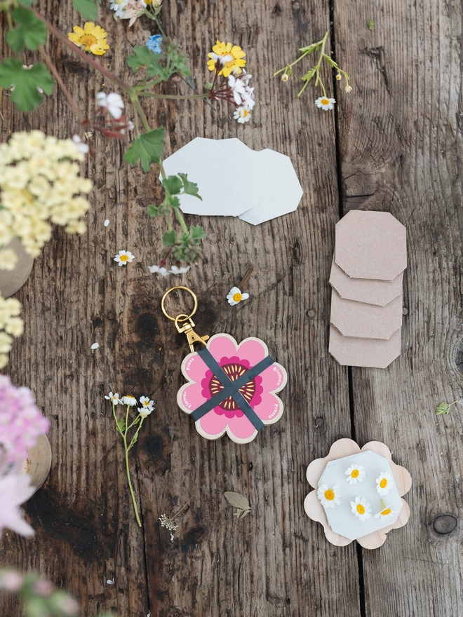Made in England using a 3mm veneered, sustainably sourced board and finished with a brass-plated keyring clasp. The silicone elastic bands are specially chosen to stay stretchy over time. Every press is lasercut and assembled in our Leeds studio, featuring digitally printed floral patterns in a variety of colours and designs.