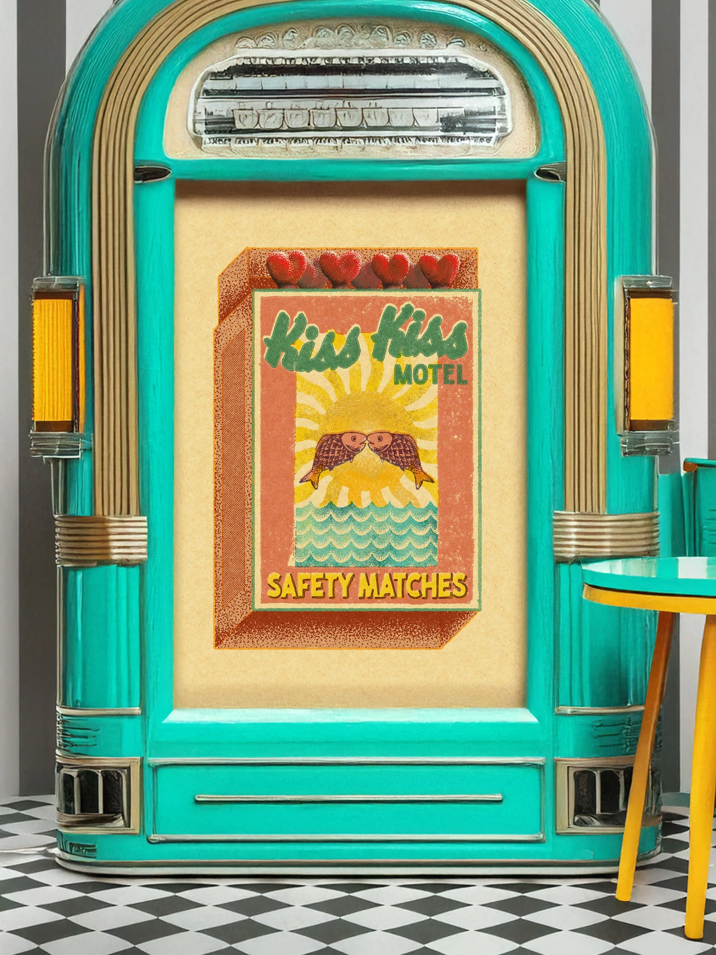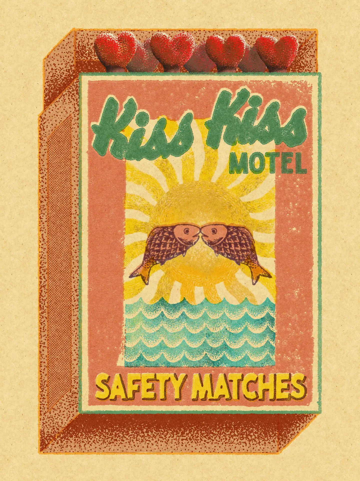 Capture the whimsical charm of a bygone era with this "Kiss Kiss Motel" vintage-style art print. Inspired by mid-century matchbook advertising and retro roadside Americana, this piece brings a splash of romance and kitsch to any space.