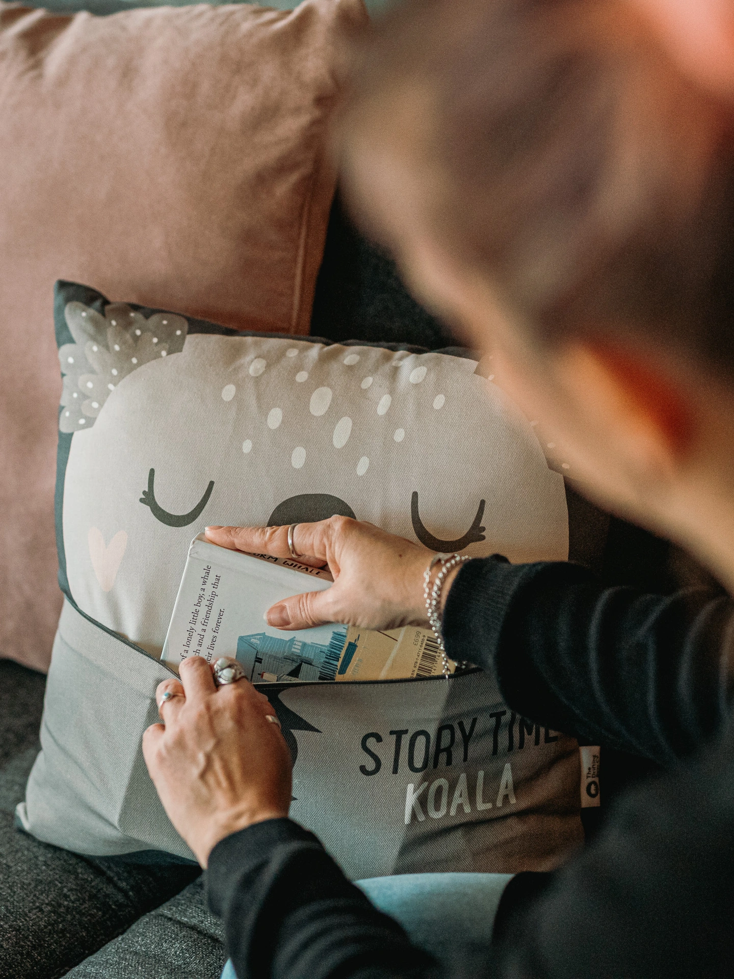 A beautifully soft, personalised Koala Story Pocket Cushion, featuring a friendly bear who holds your child’s favourite book in the pocket. Handmade in the UK, it brings calm, comfort and imagination for every bedtime or story time