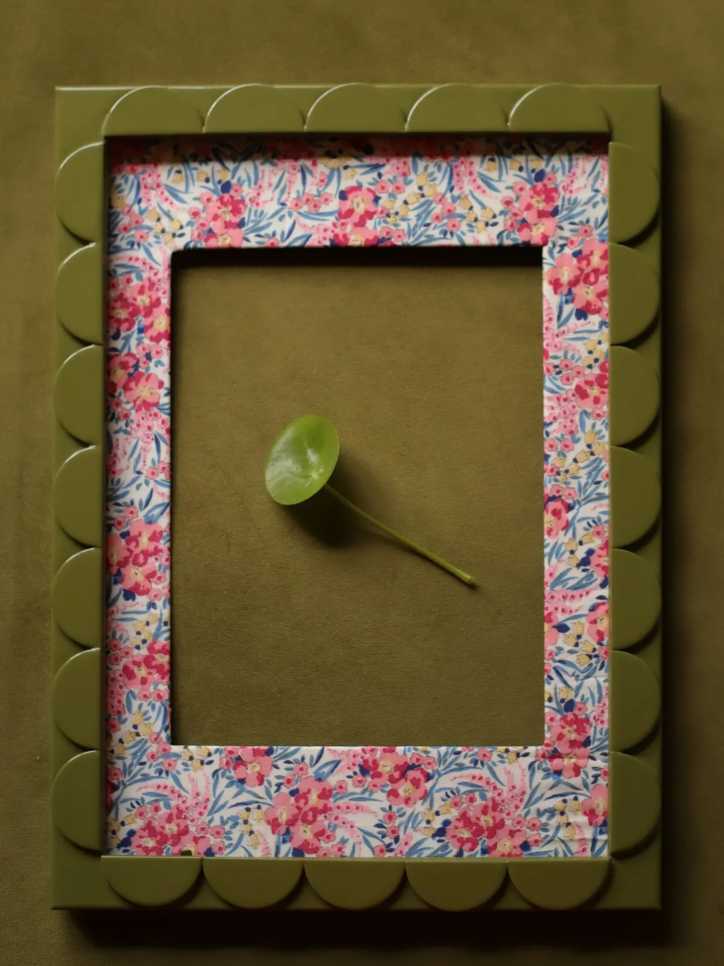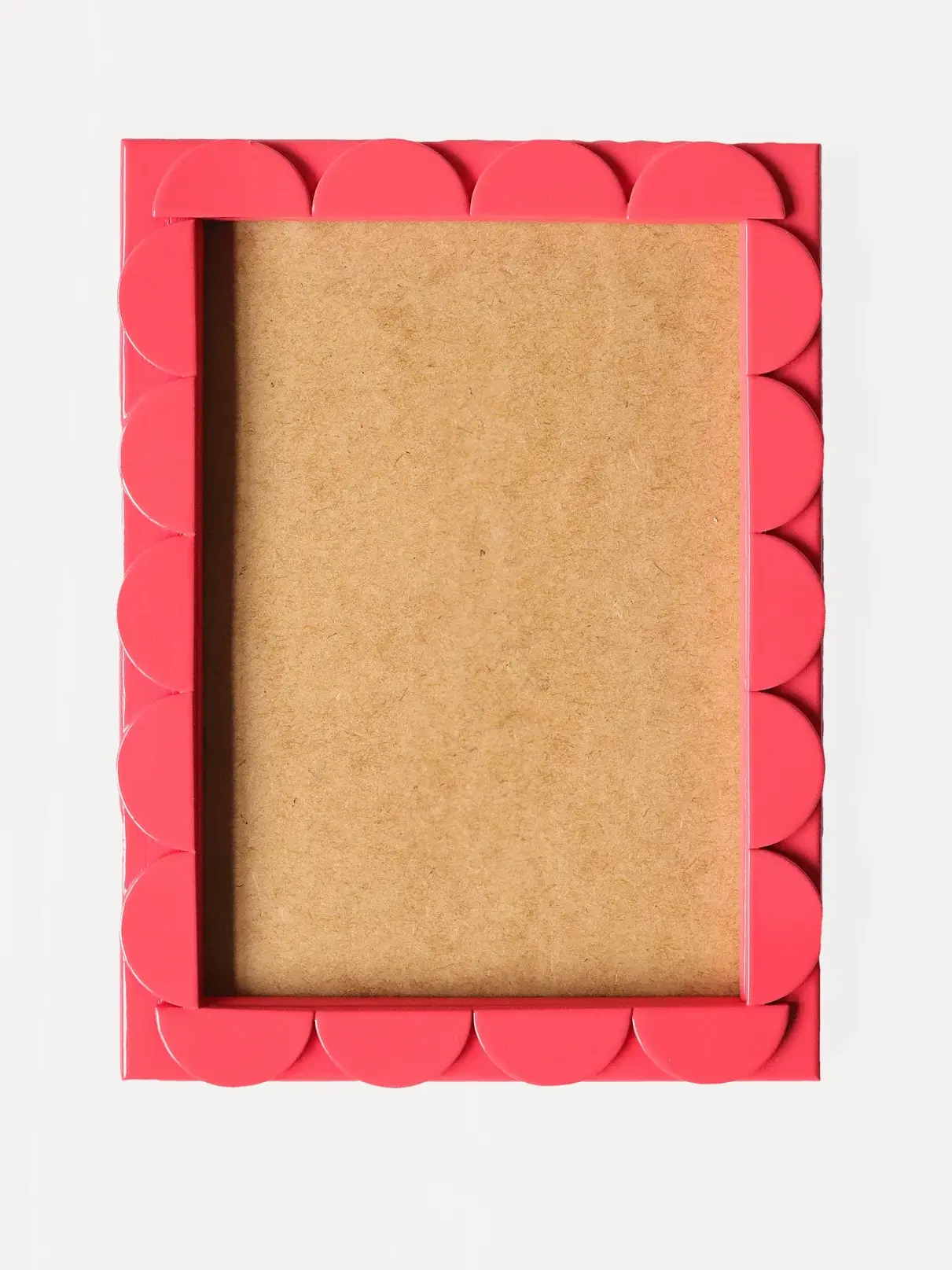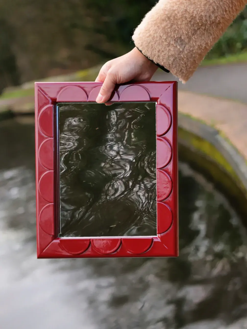 Float glass set inside a wooden rectangular frame, embellished with scalloped shapes and finished in a glossy, colourful lacquer.