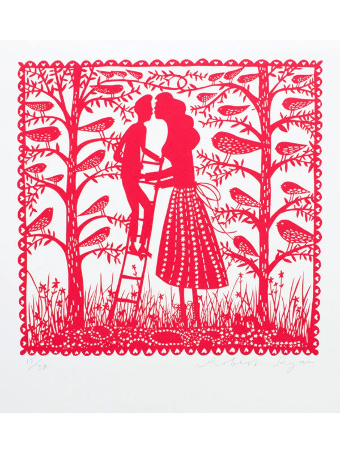 Red screenprint on a white background of two people kissing on a ladder.