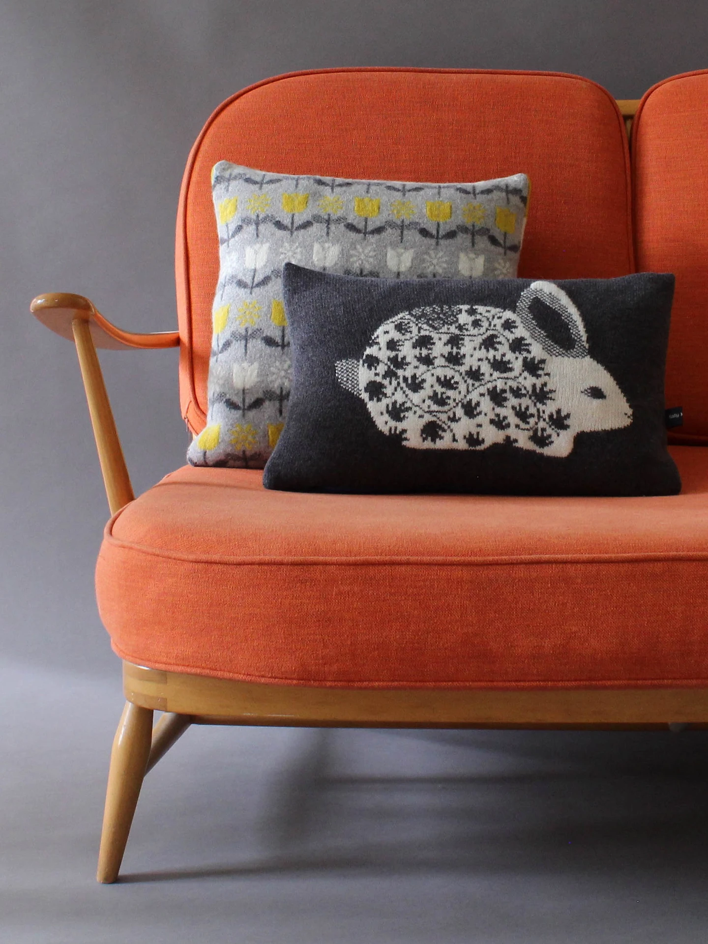 Designed and made in my studio in Norfolk using double thickness 100% lambswool yarn for a more substantial, softer feel, it has a orange zip fastening and is stuffed with a duck feather cushion pad. Can be used as a cushion or pillow on your favourite chair, or to decorate a bed.