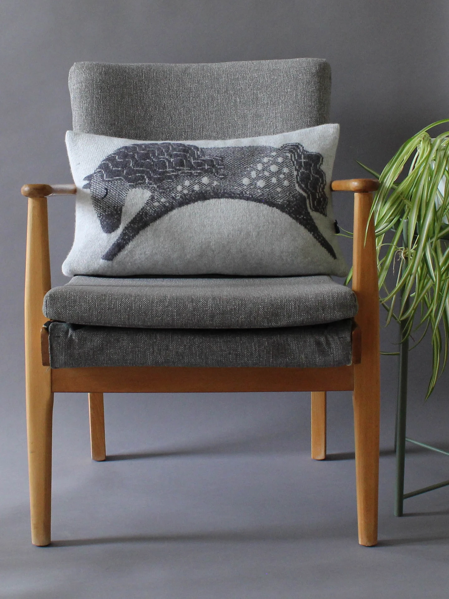 Designed and made in my studio in Norfolk using double thickness 100% lambswool yarn for a more substantial, softer feel, it has a black zip fastening and is stuffed with a duck feather cushion pad.