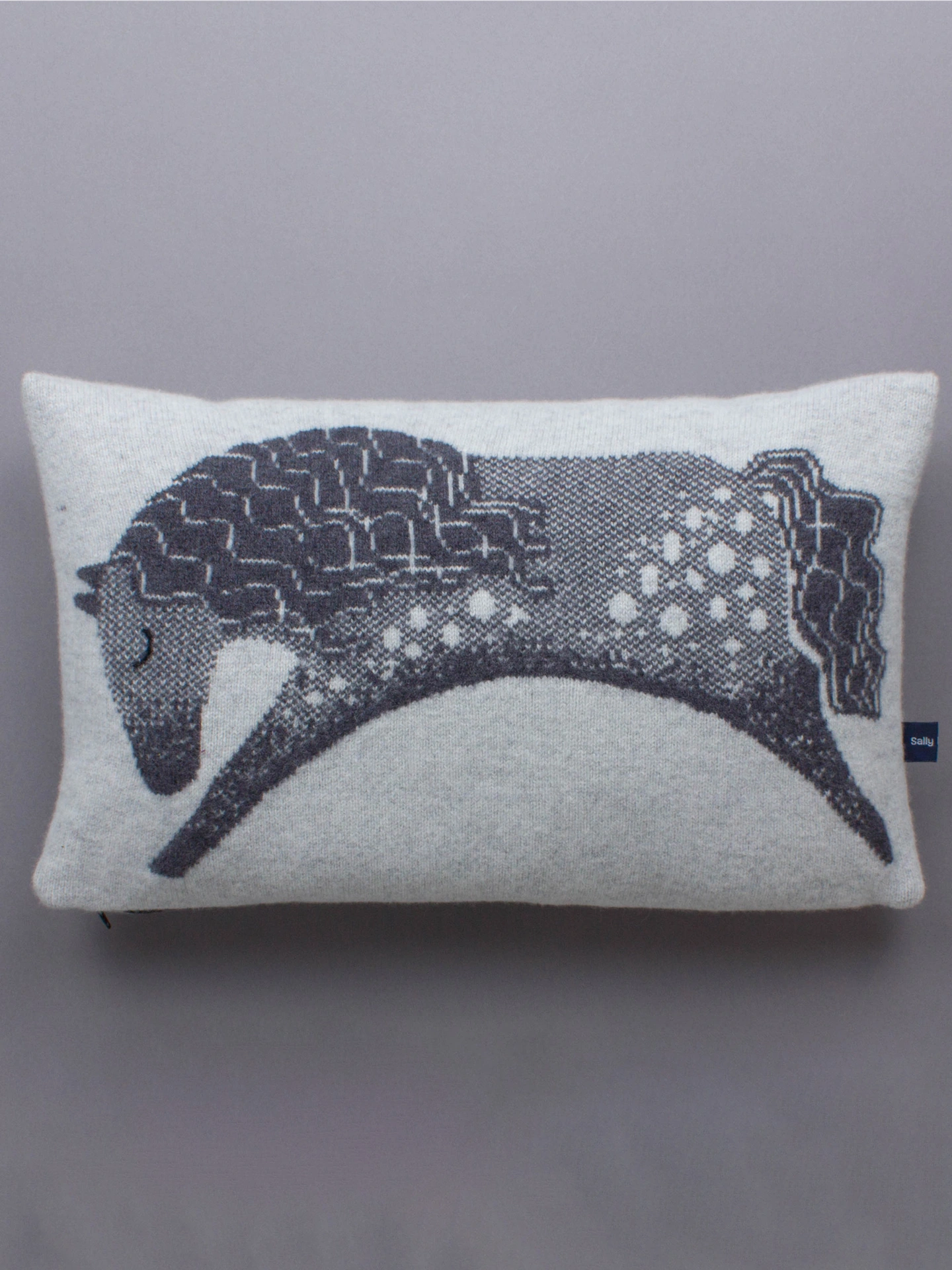 This knitted lambswool Dapple Horse cushion is lightly felted after knitting to create a soft and more substantial cover. It features a sleepy eyed dapple horse with flowing mane and tail. Inspired by my childhood pony ‘Blue’. I like to add a small motif...