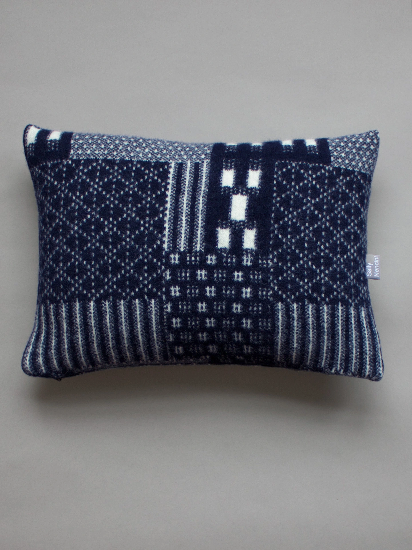 This knitted lambswool Ikat patchwork cushion is inspired by Ikat woven designs and boro patchwork mending.