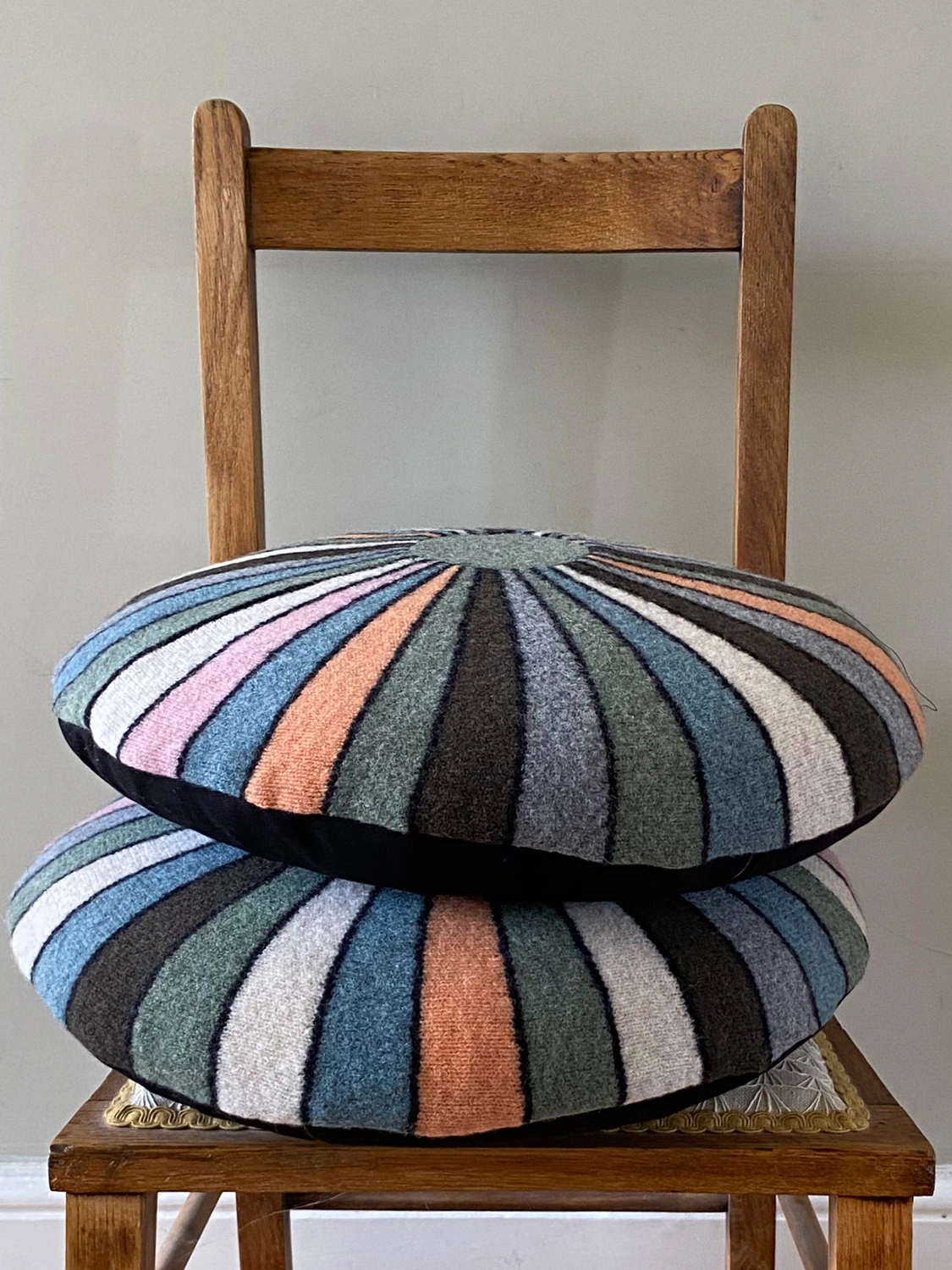 This Kaleidoscope cushion is a colourful wheel of knitted lambswool.