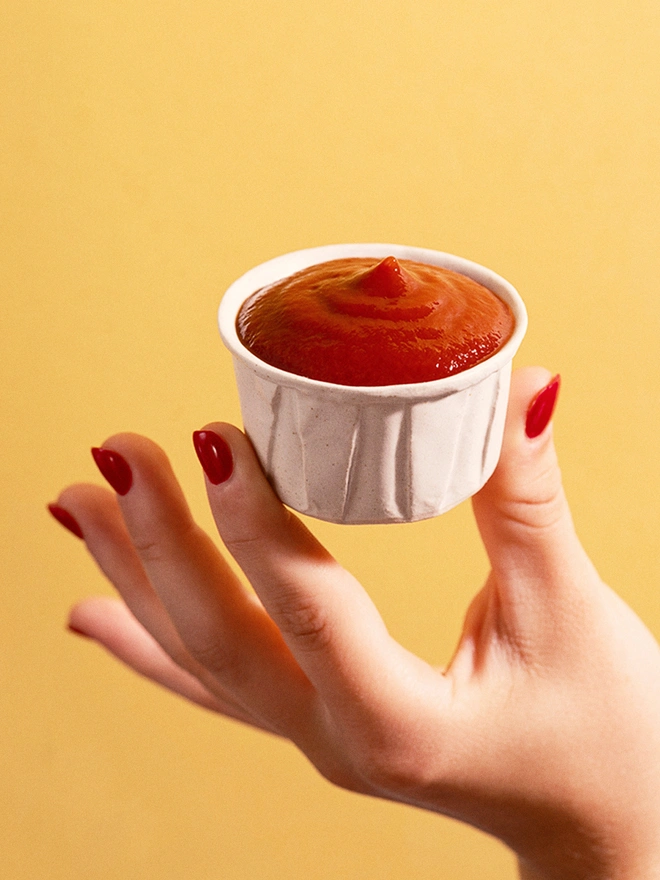 Puts a quirky twist on the disposable paper sauce containers you normally see in fast-food restaurants.