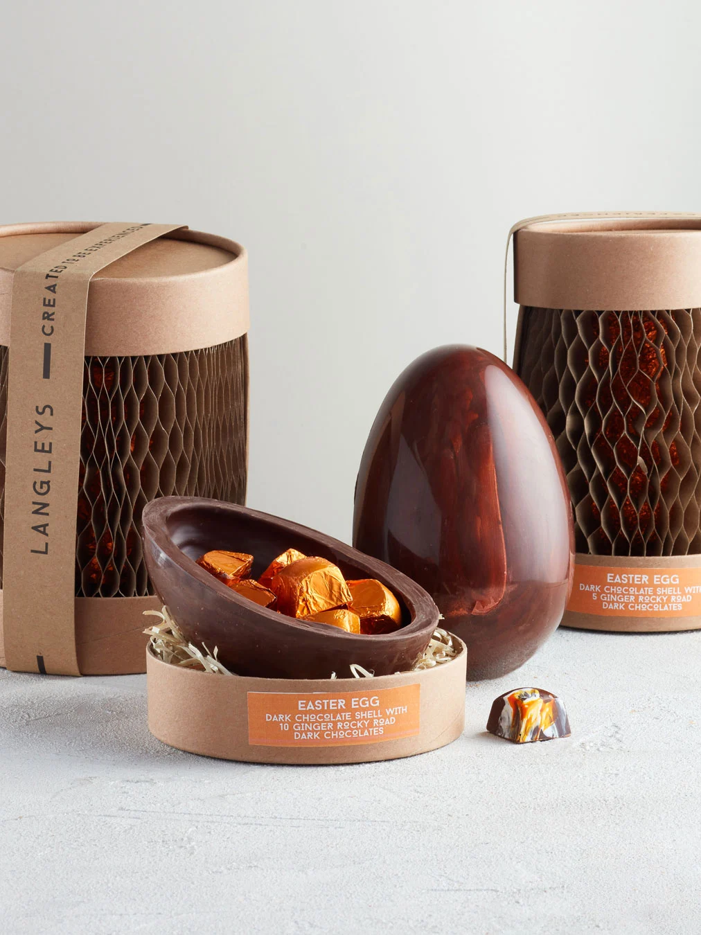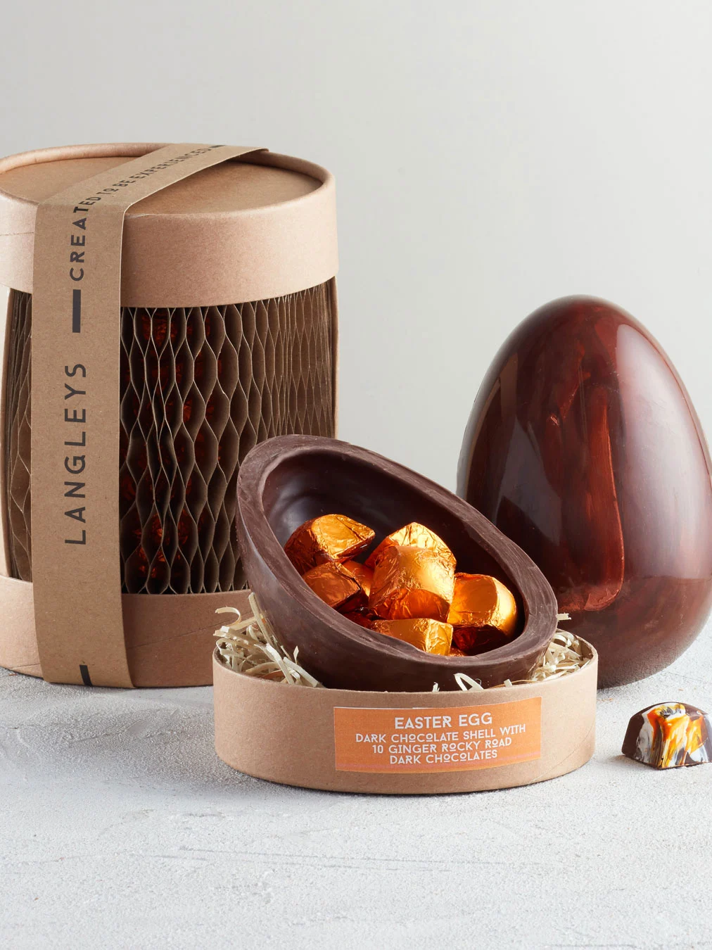 Langleys Easter egg with dark chocolate shell containing Ginger Rocky Road.