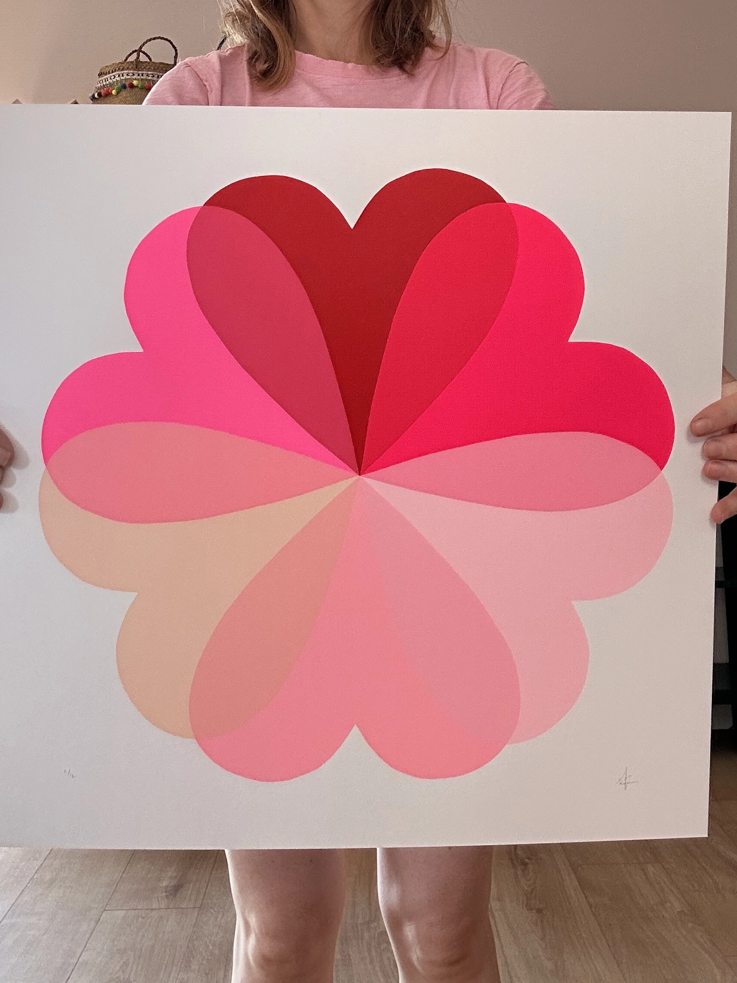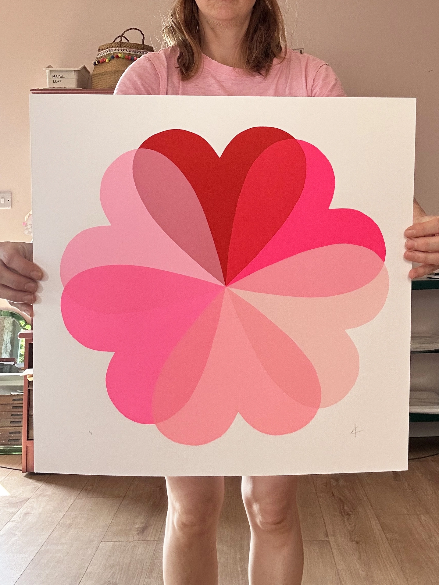 Hearts and Flowers Screen Print hand printed by Hannah Carvell in the brightest colours Zesty Oranges and Neon Pinks. A NEW release limited edition screen print. Each of the six hearts are printed by hand and every colour used is a separate layer and screen, the inks are mixed and diluted to overlap and create depth and colours within the piece. Love Hearts printed into a Flower.
